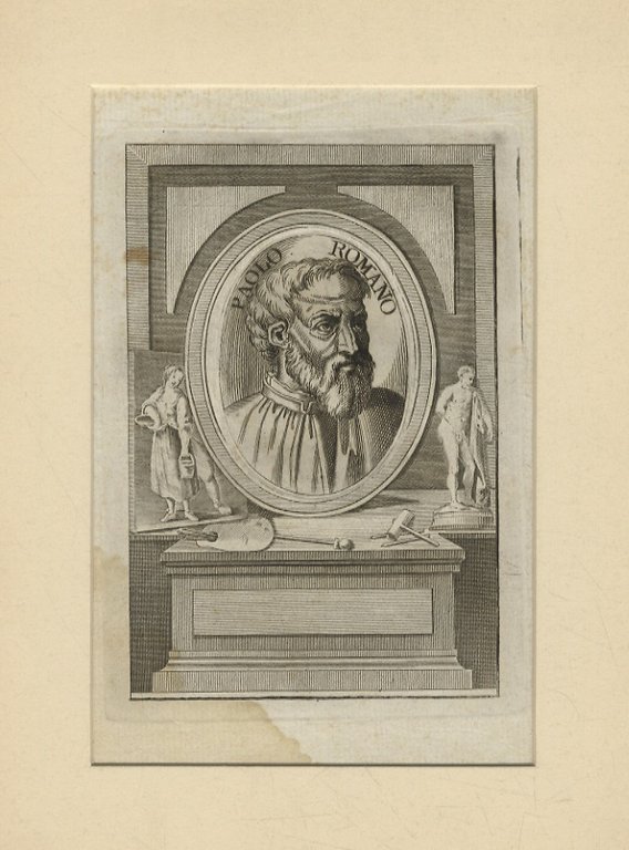 Paolo Romano. (Ritratto a mezzo busto, di 3/4 verso destra, con barba; in una cornice ovale posta su basamento, ai lati del quale si trovano: a sinistra piccola tela raffigurante una popolana romana e a destra nudino maschile in scultura. Frontalmente gli strumenti delle arti evocate: tavolozza e bastone reggipolso, martello e scalpello).