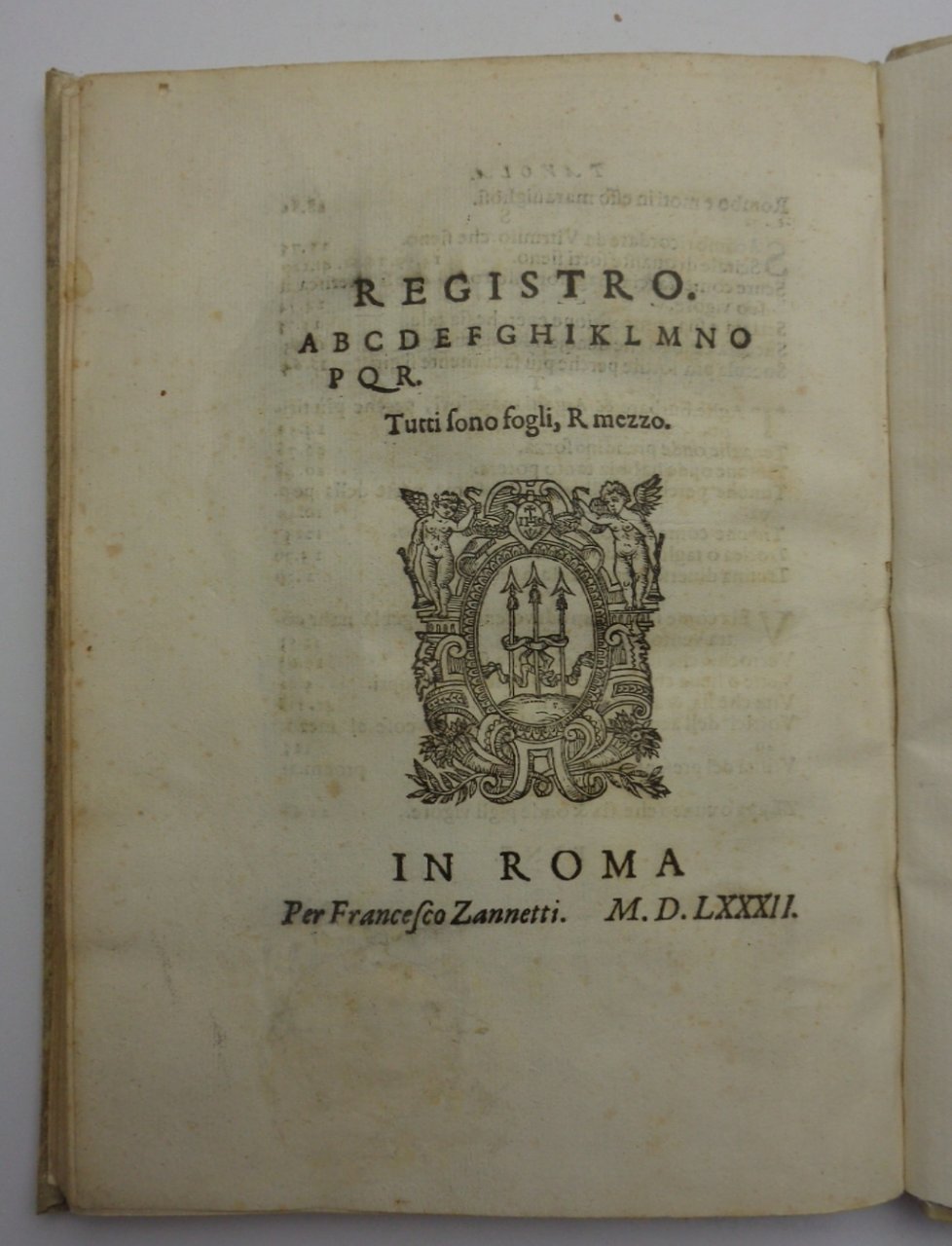 Un volume (16,5x23 cm) di 127-(5) pagine (segnatura A4-Q4, R2), con illustrazioni xilografiche nel testo. Alla pagina di titolo stemma cardinalizio in rosso e nero. Legatura moderna con pergamena antica. Una macchia chiara sul margine esterno del frontespizio; alla pagina finale del colophon l'ombra circolare di un possibile bollo, cancellato. Per il resto volume di notevole freschezza, a margini ampi e con le figure in perfetta stampa. "L'ouvrage de Piccolomini (1508-1578) parut alors qu'on s'interrogeait sur la manière d'ériger les obélisques, particulièrement celui qui se dressera sur la place Saint-Pierre de Rome (érigé en 1586). A la page 72, une grande figure montre comment lever une colonne, avec son socle au moyen de cordages, d'un cabestan et d'un cheval" (Sotheby's Paris 2010).