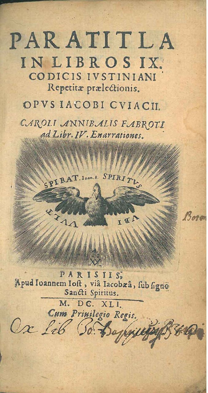 Paratitla in libros IX codicis iustiniani Repetitae Praelectionis. Opus Iacobi Cuiacii. Caroli Annibalis Fabroti Ad Libr. IV Enarrationes. Parisiis, Apud Ioannem Iost. 1641. Legato assieme: Paratitla in libros V. VI. VII. VIII e IX codicis iustiniani rep