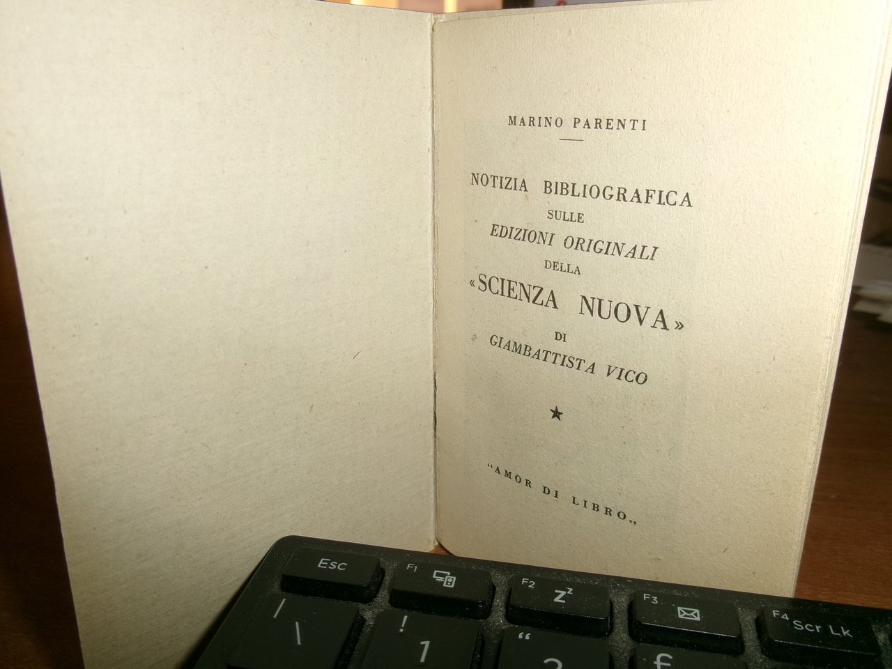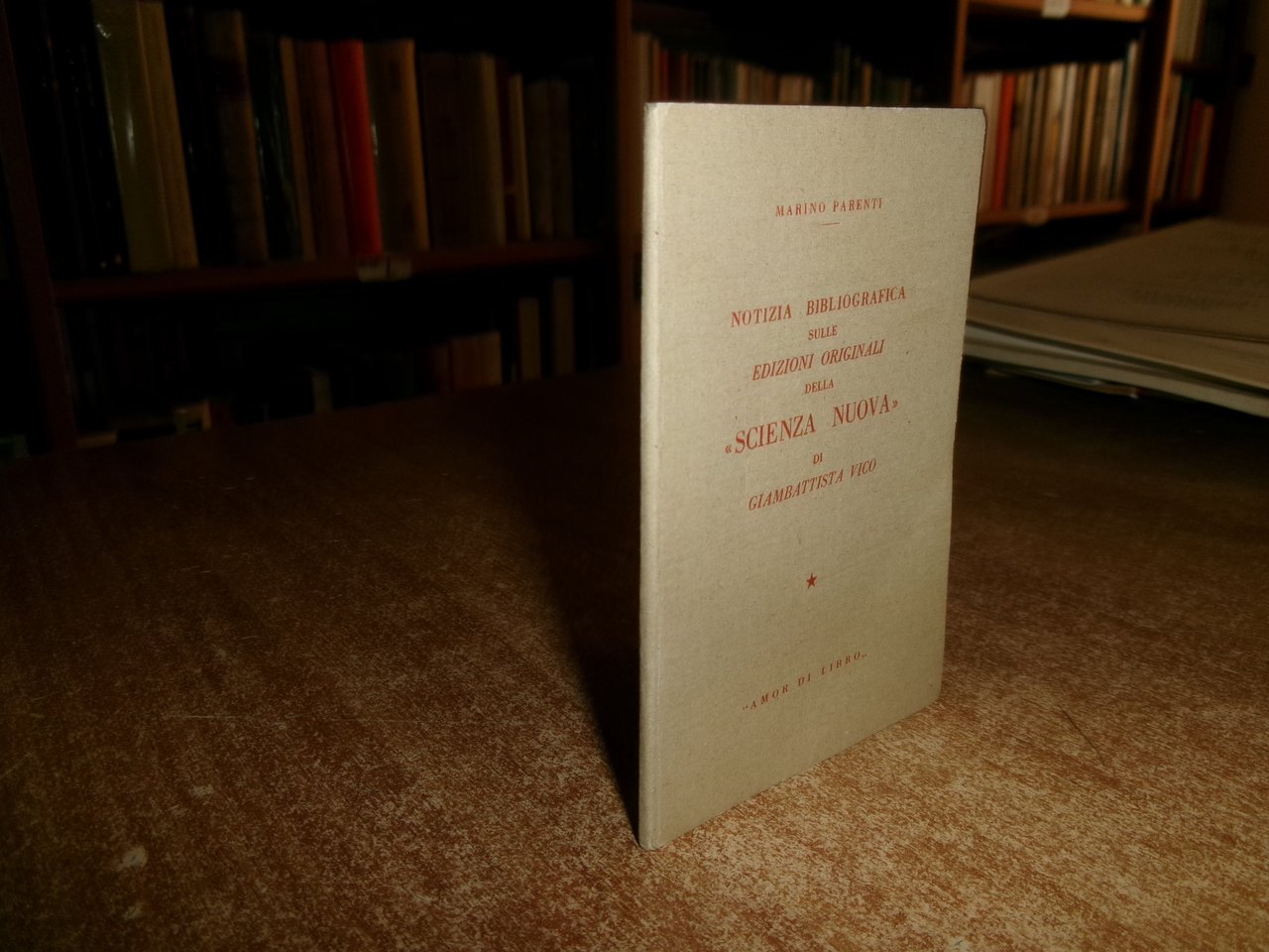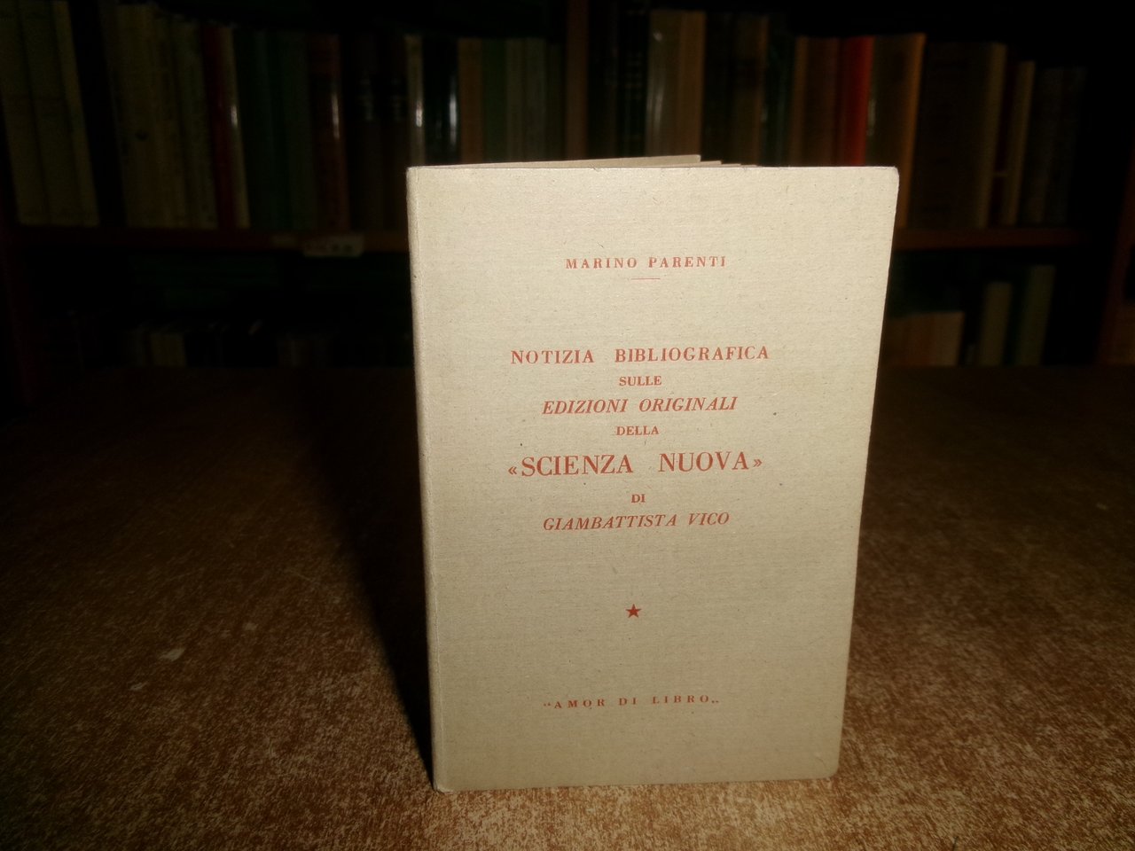 Parenti Marino. Notizia bibliografica sulle edizioni della "Scienza Nuova" di G. Vico. Amor di Libro s.d. circa, 1950. In-24° pp. 34 con 1 illustrazione. Brossura edit. Tiratura di 300 copie numerate (190). Ottimo stato. Neg. mens. bianca cassa scat. fiori entro pluriball