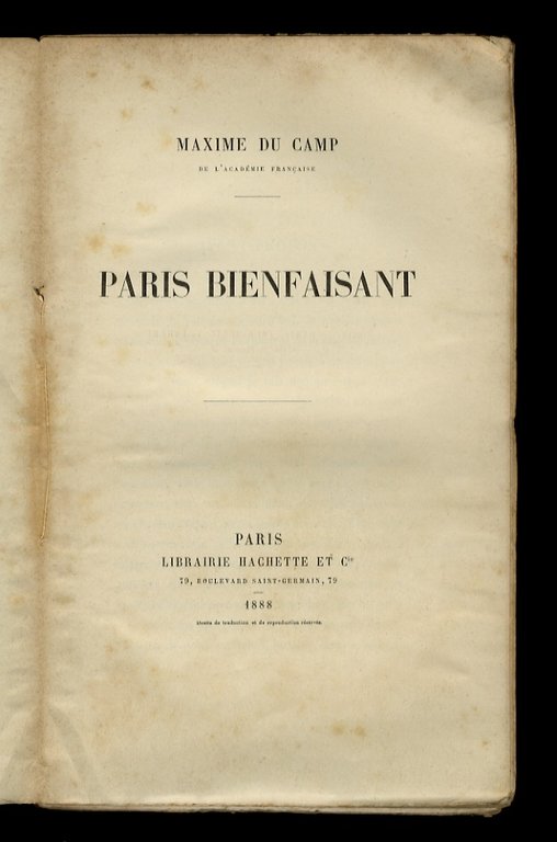 Paris, Librairie Hachette et C.ie, 1888, in-8, br. editoriale (ma manca la copertina anteriore e il dorso reca piccole mancanze), pp. 546. Si tratta di una serie di resoconti di visite agli enti benefici - ospedali, orfanotrofi, rifugi e mense - della Parigi povera della seconda metà dell'Ottocento. Primi ed ultimi fascicoli allentati.