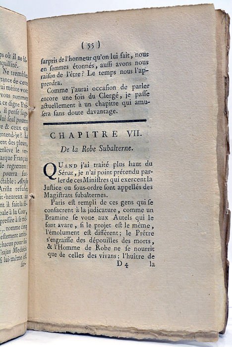88 pages. (17,5x11,5 Cm). Cartonnage ancien. Manques au dos. Plats frottés. Rare pamphlet du célèbre littérateur nancéen François Antoine Chevrier, dans lequel il raille les institutions françaises et leurs représentants. Une clé placée à la fin du volume, permet d’identifier les notables cités dans l’ouvrage. Joli bois gravé sur la page de titre, dans le style des marques d’imprimeurs de la Renaissance. Bon exemplaire.