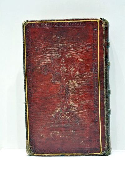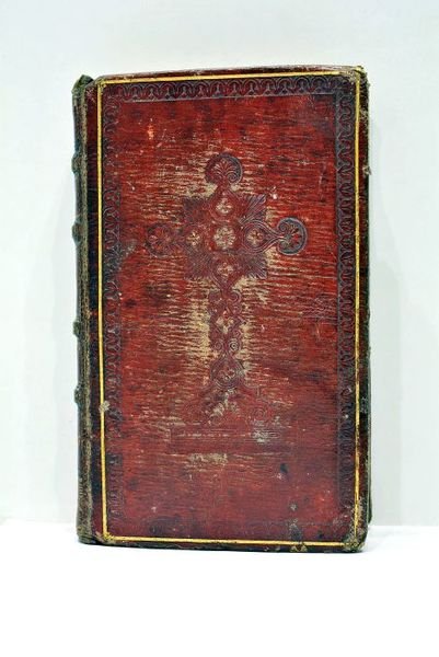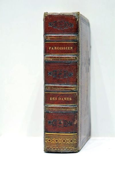 in-16. 8 feuillets. 457 pages. Pages 485-664. 6 planches hors-texte gravées. (13,5x8,5cm). Plein maroquin rouge à grains longs de l'époque. Dos à nerfs orné à l'or et à froid et titré en lettres dorées. Filet doré en encadrement des plats avec une frise d'encadrement et une croix au centre des plats estampés à froid. Filet doré sur les coupes. Tranches dorées. Frise intérieure dorée. Gardes de soie moirée bleu. Reliure frottée. Quelques feuillets détachés. Le dernier déchiré avec manque. Quelques rousseurs. Marques de plis. Un exemplaire très élégamment relié dans un plein maroquin rouge orné du temps. Livre de piété agrémenté de 6 belles gravures hors-texte par Delignon. Mérite une restauration.