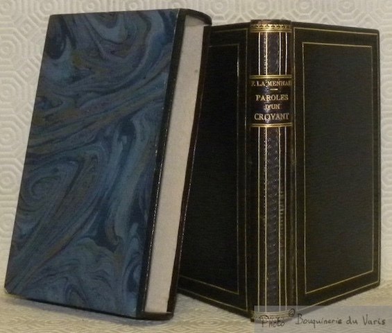 - reliure pleine chagrin. Auteur, titre filets et ornementations dorés au dos. Double encadrements dorés sur les deux plats avec guirlande à froids. Tranche supérieure dorée. Guirlandes dorées à l’intérieur des deux plats. Garde marbré. Couvertures conservées. Sous emboitage marbré. Belle reliure. Nom du possesseur sur le haut de la page de garde supérieure, autrement très bel exemplaire.