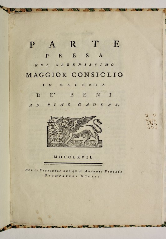 Parte presa nel Serenissimo maggior Consiglio in materia de' beni. Venezia, Pinelli, 1767. (Insieme a:) Parte presa…in materia degli ordini regolari. Venezia, Pinelli, 1768. (Insieme a:) Proclama.alle decime del clero.