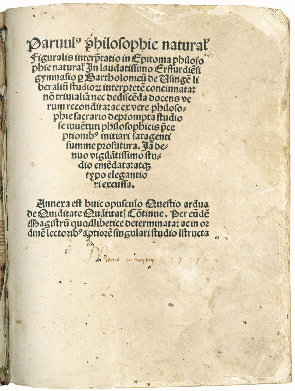 Parvulus philosophiae naturalis Figuralis interpretatio in Epitoma philosophiae naturalis in laudatissimo Erffurdiensi gymnasio per Barth. de Usingen liberalium studiorum concinnata [...] Annexa est huic opuscolo Quaestio ardua de Quiditate quantitatis continuae