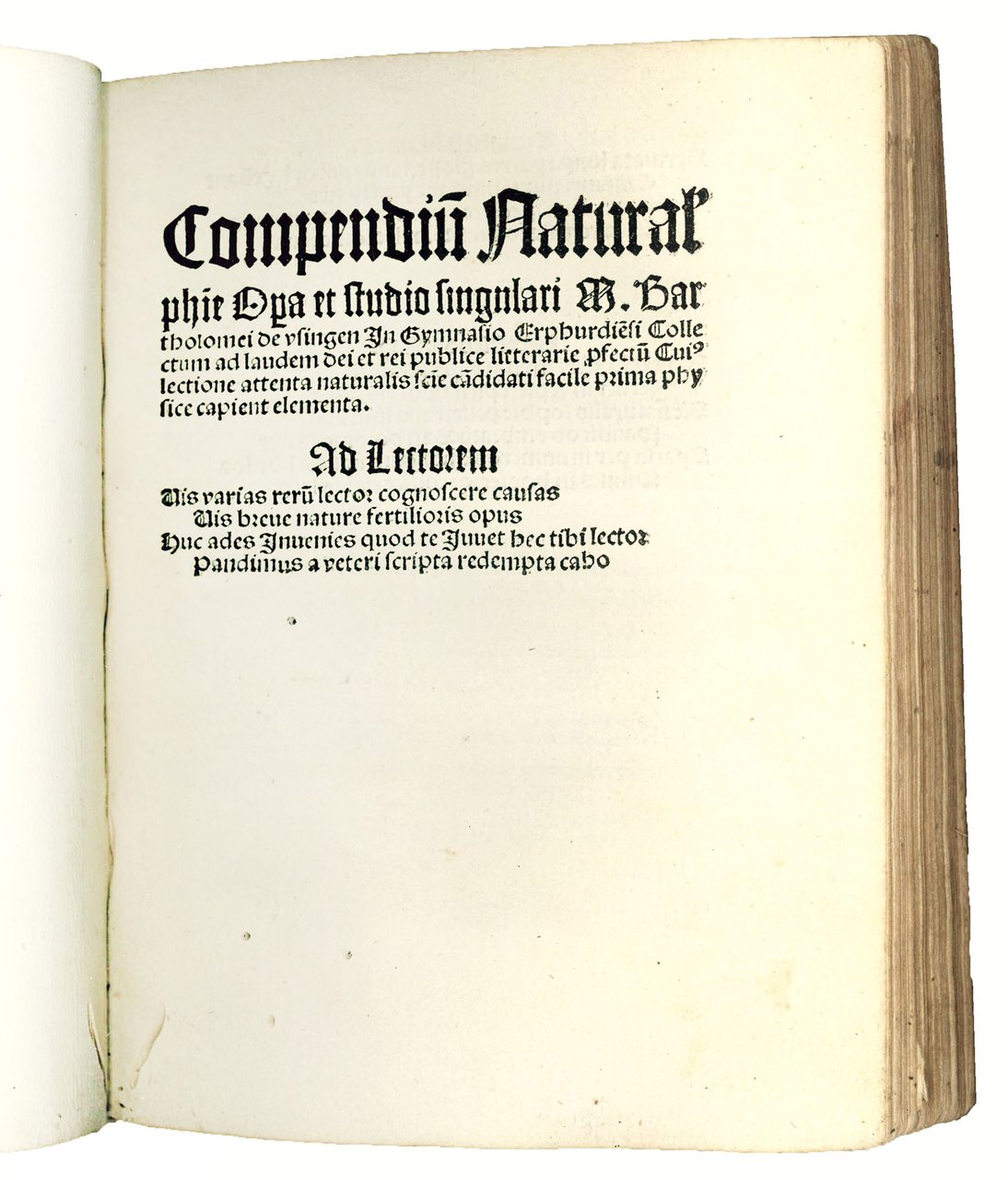 [Bound with] EIUSDEM. Compendium Naturalis philosophiae Opera et studio singulari M. Bartholomei de Usingen In Gymnasio Erphurdiensi Collectam ad laudem Dei et ei publicae litterariae [...] Erfurt, Wolfgang Schenck, [1507].