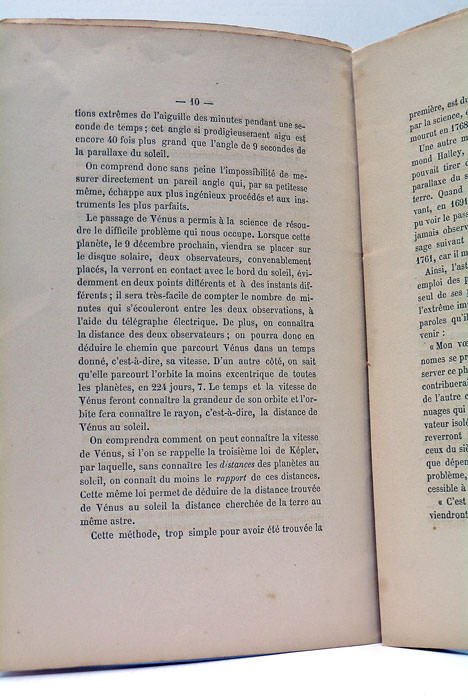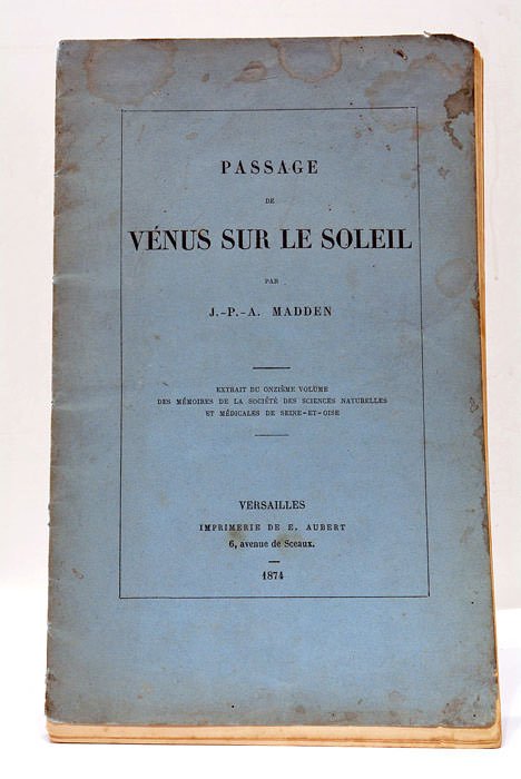 23 pages. Broché. Couverture détachée imprimée un peu tachée. Extrait du onzième volume des mémoires de la Société des sciences naturelles et médicales de Seine-Et-Oise. Il s'agit de la partie du travail de Madden dans laquelle il traite du passage de la planète Vénus sur le disque du soleil.