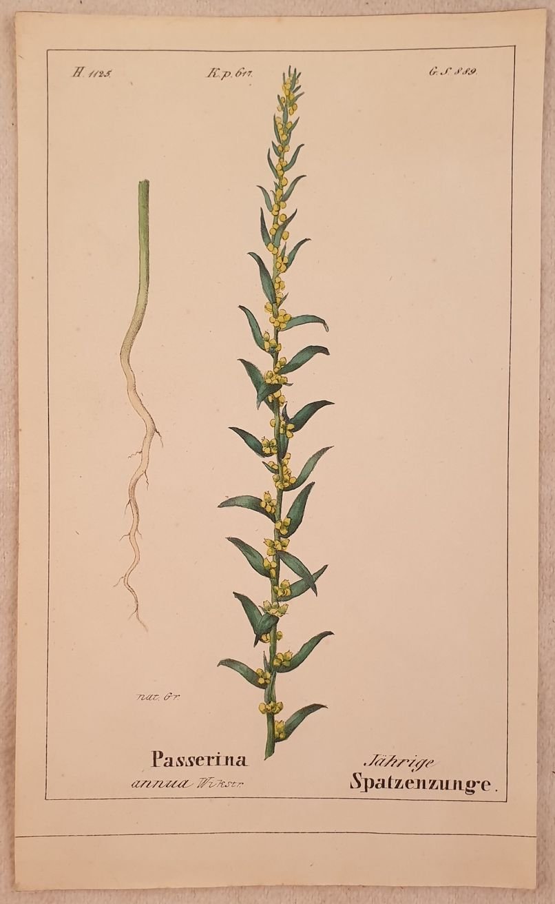 Bella cromolitografia del 1843 tratta dalla celebre opera di botanica "Flora der Schweiz" di Heinrich Romer sulla flora della Svizzera che rappresenta la Lygia passerina fasano.<BR>In buone condizioni, qualche fioritura. Segni di colla al verso. Passerina annua TECNICA: Cromolitografia DIMENSIONI FOGLIO: cm 17,5x11 DIMENSIONI INCISIONE: cm 15,5x9,5 EPOCA: 1843 CONDIZIONI: Buone condizioni, qualche fioritura. Resto di colla al verso. Beautiful chromolythography of 1843 taken form the famous work of botany "Flora der Schweiz" by Heinrich Romer about flowers of Switzerland representing the Passerina annua. In good conditions, some foxings. Glue signs in the verso of page Passerina annua TECHNIQUE: Lytography PAGE SIZE: cm 17,5x11 PRINT'S SIZE: cm 15,5x9,5 PERIOD: 1843 CONDITION: good conditions with some foxings. Little tears in the lower edge. Glue signs in the verso of page.