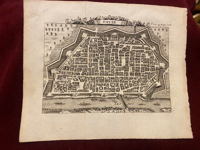 Incisione originale raffigurante la piantina della città di Pavia tratta da: Les delices de l'Italie contenant une description exacte du Pais…Paris, par la Compagnie des Libraires, 1707. L'incisione misura 18,8 x 15,5 il foglio e 14,6 x 10 più cornice, la mappa. Buone le condizioni e l'inchiostratura.