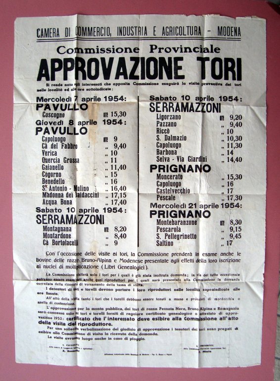 Pavullo Serramazzoni Manifesto Approvazione Tori CCIA Modena 1954