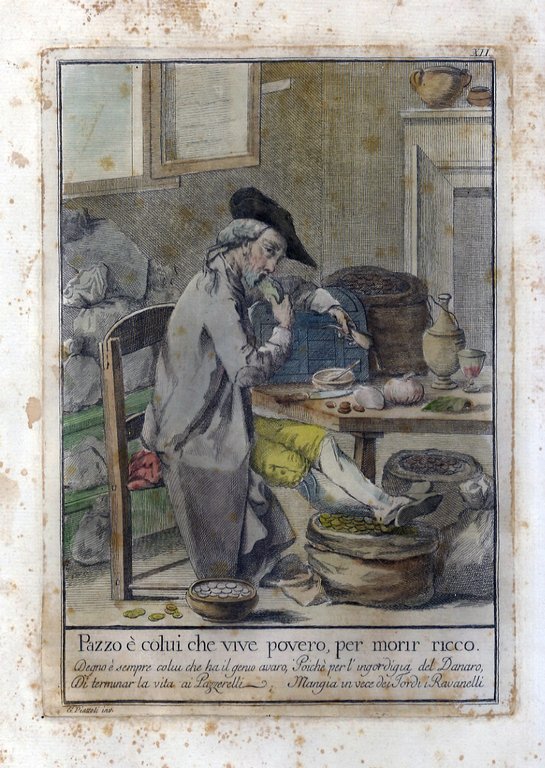 [Firenze], [N. Pagni e G. Bardi], [1786], incisione in rame acquerellata a mano, mm. 290x210 (impronta della lastra), 428x300 (il foglio). Tratta da "Proverbi toscani espressi in figura da Giuseppe Piattoli pittore fiorentino", parte prima (formato verticale). Il testo del proverbio è inciso in lastra sotto all'immagine. In alto a destra il numero della tavola (n. XII). In basso a sinistra la firma in lastra (G. Piattoli inv.). Bruniture e fioriture diffuse; in cornice laccata in verde ed oro con vetro di protezione.