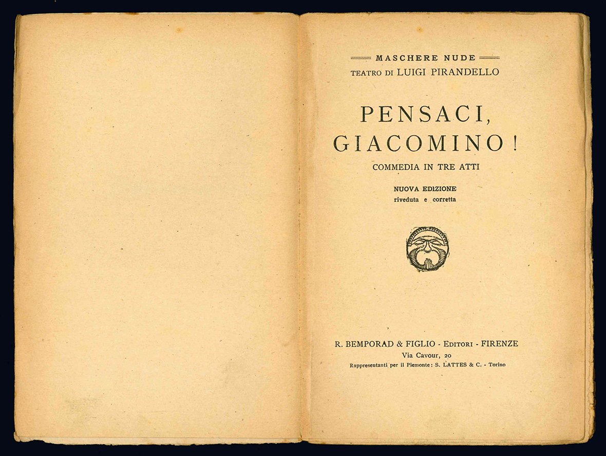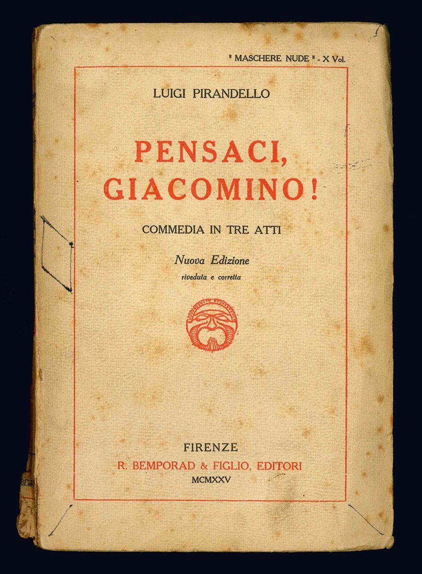In 16mo (mm 190x118); pp. 132, [2]. Carta uniformemente brunita, lievi fioriture ad alcune carte. Copertina editoriale stampata in rosso e in nero. Segni d'usura ai margini, fioriture diffuse, minime mancanze al margine inferiore del dorso. Volume della collana "Maschere nude. Teatro di Luigi Pirandello", X Volume.