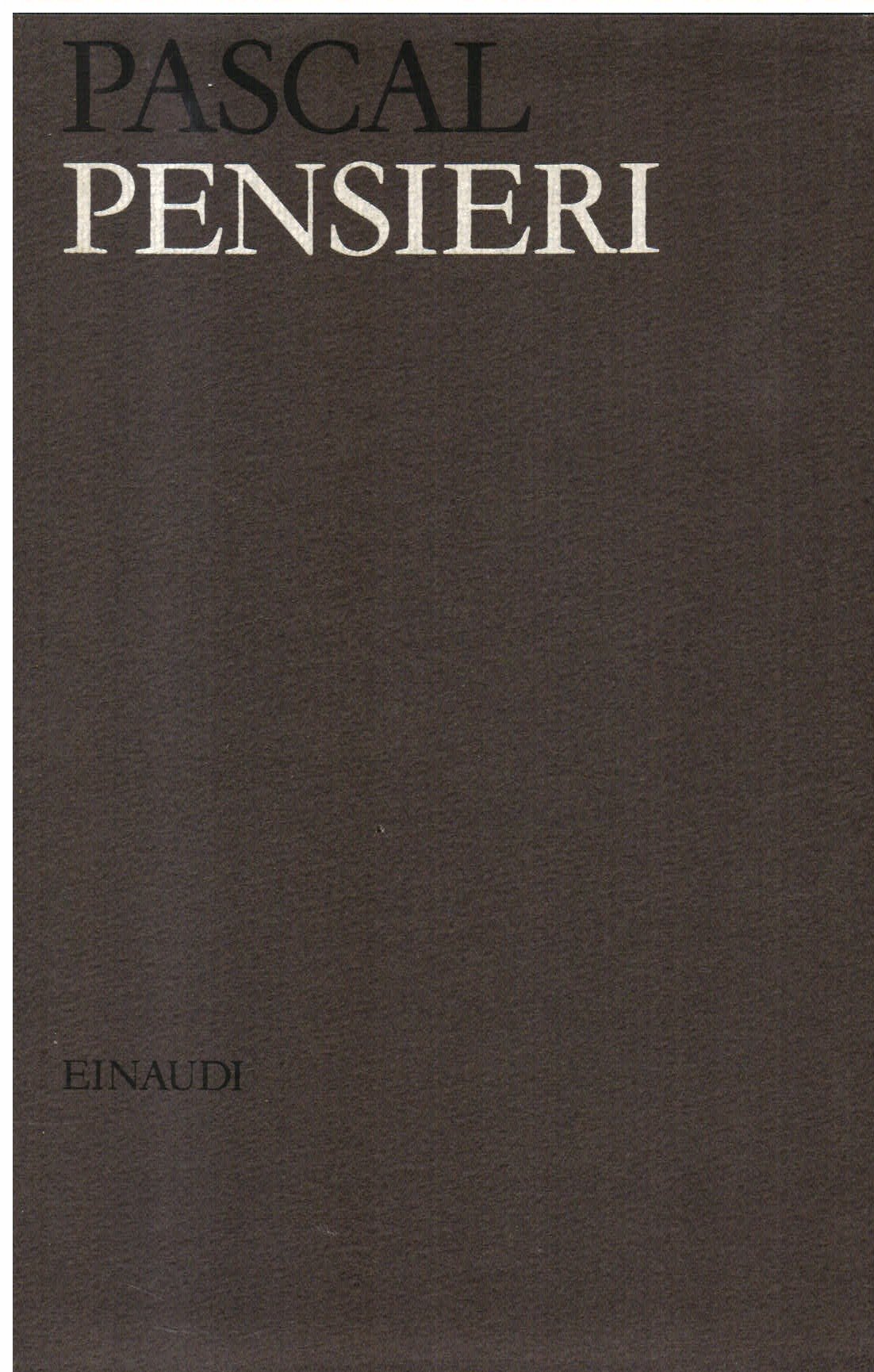 In-8° (22x14.5 cm) tela rigida con sovracoperta figurata con alette paratestuali protetta da acetato e cofanetto muto in cartoncino editoriali, taglio superiore marrone. Pp XLVI, 478, (2). I Mllenni, 56 (terza edizione). Minimi difetti al dorso ma più che buon esemplare. Edizione italiana di riferimento per cura critico-filologica e nota biobibliografica. In fine presente la tavola di concordanza della numerazione dei pensieri della presente edizione con la Brunschvicg.