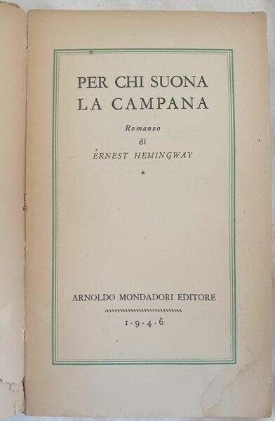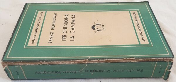 Seconda edizione italiana del 1946 del celebre romanzo di Ernest Hemigway (1899-1961). Titolo originale "For whom the bell tolls". Numero 166 della collana Medusa "I grandi narratori d'ogni paese". Traduzione di Maria Napolitano Martone. In buone condizioni. Copertina editoriale in discrete condizioni generali con lievi usure ai margini e dorso. Piatto anteriore staccato. Legatura in buone condizioni. All'interno le pagine si presentano in buone condizioni con rare fioriture. Lieve gora d'umidita all'angolo inferiore destro delle prime 40 pagine. In 8. Dim. 19,5x12 cm. Pp. 480+(4). Second italian edition of 1946 of this novel by Ernest Hemigway (1899-1961). Original title "For whom the bell tolls". Number 166 of the series Medusa "I grandi narratori d'ogni paese". Translation by Maria Napolitano Martone. In good conditions. Editorial cover in fair general conditions lightly worn in the extremities. Front plate is detached. Binding in good conditions. Inside pages are in good conditions with occasional foxings. Light dump stain in the lower right corner of the first 40 pages. In 8. Dim. 19,5x12 cm. Pp. 480+(4).