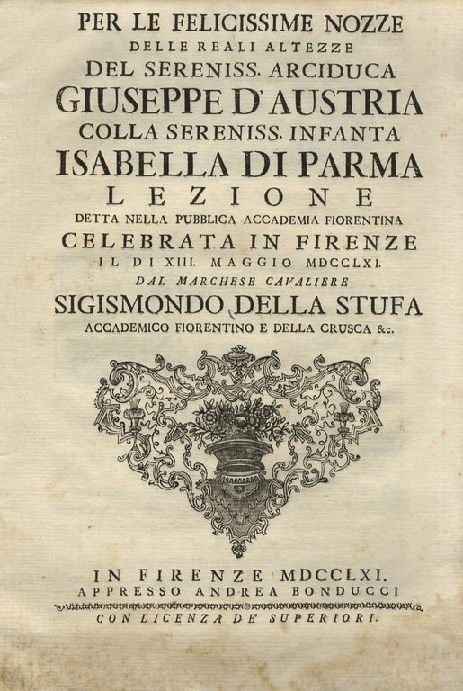 Per le felicissime nozze delle reali altezze del sereniss. arciduca Giuseppe d'Austria colla sereniss. infanta Isabella di Parma lezione detta nella pubblica accademia fiorentina [.] dal marchese cavaliere Sigismondo Della Stufa accademico fiorentino e della Crusca & c.
