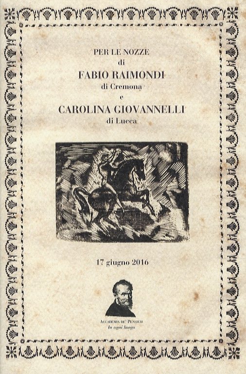 Valdinievole, per le stampe dell'Accademia de' Pensieri, 17 giugno 2016, in-8, brossura editoriale, pp. 15, [1]. Con illustrazioni comprese nella paginazione. Edizione di 99 esemplari.