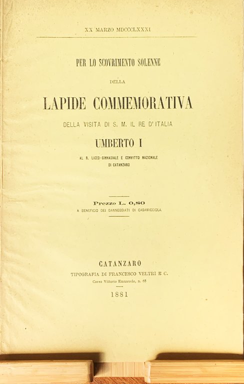 I ed. Il ricavato delle vendite del volumetto furono previste a beneficio dei Danneggiati di Casamicciola (Casamicciola Terme, Isola d'Ischia-NA). In-8, pp. 12, brossura in carta paglierina con titoli in nero. Statao buono (leggero stato d'uso della copertina ai margini - copertina e pagine lievemente brunite). "Il Collegio dei professori del Liceo-ginnasiale per invito del Preside-Rettore Dott. Paolo Pavesio si raccoglieva in adunanza straordinaria, il 24 gennaio 1881 alle ore 10 antim. (. . .) / Il Collegio ad esprimere la propria gratitudine per la visita si S. M. il Re a questo Liceo-ginnasiale e Convitto Nazionale, avvenuta due giorni prima, unanime deliberava doversi murare una lapide commemorativa, nell'ingresso dello Istituto; affidando al Preside di dettarne la iscrizione, e fissando per la inaugurazione il giorno 14 marzo, genetliaco dell'Augusto Visitatore. Per imprevedute circostanze la cerimonia dello scovrimento si dovette rimandare al 20 marzo" (dalla premessa, p. 3). Indice. Premessa - trascrizione della lapide commemorativa (testo del Preside-Rettore del R. Liceo-ginnasiale e Convitto Nazionale di Catanzaro datato XXIV gennaio-XIV marzo MDCCCLXXXI) - discorso per lo scovrimento solenne della Lapide Commemorativa della Visita di S. M. il Re d'Italia Umberto I al R. Liceo-ginnasiale e Convitto Nazionale di Catanzaro; Dott. Paolo Pavesio Preside-Rettore (Catanzaro, 19 marzo 1881)