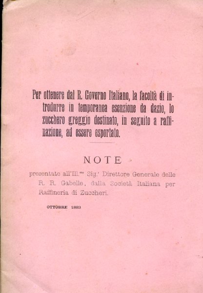 Per ottenere dal R. Governo Italiano, la facoltà di introdurre in temporanea esenzione da dazio, lo zucchero greggio destinato, in seguito a raffinazione, ad essere esportato. Note presentate all'Ill.mo Sig.r Direttore Generale delle R. R. Gabelle, dalla Società Italiana per Raffineria di Zuccheri. Ottobre 1883