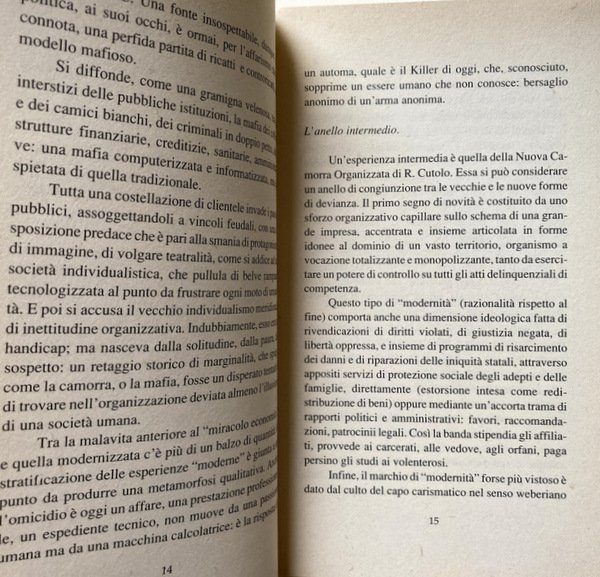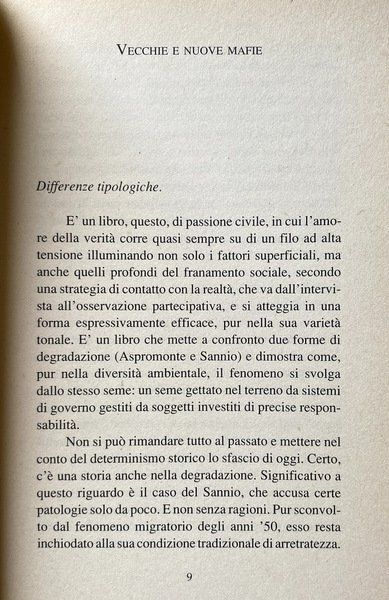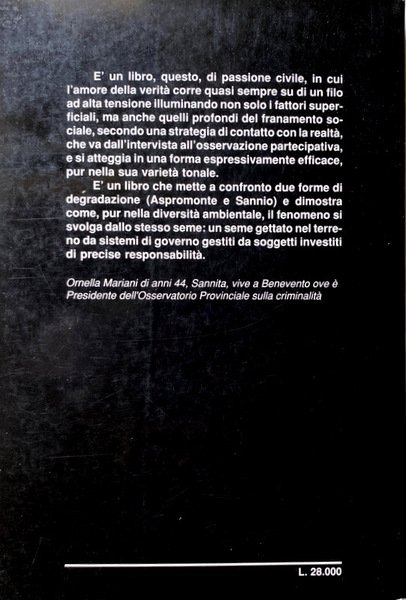 Soggetti: Attualità, Criminalità organizzata, Storia, Imprenditoria, Partiti, Campania, Calabria, Italia meridionale, Sud, Sannio, Aspromonte, Degrado sociale, Società, Fenomeni sociali, Inchieste, Reportage, Viaggio, Mentalità criminale, Interviste, Politica locale, Collusione, Soldi, Riciclaggio, Abusivismo edilizio, Appalti, Pasquale Micchia, Clan camorristici, Giornalismo, Giovani, Disoccupazione, Lavoro, Terremoto, Ricostruzione, Traffici illeciti, Droga, Mercato, Spaccio, Racket, Osservatorio, Denunce, Degradazione, Rifiuti tossici, Investimenti, Benevento, Napoli, Provincia, Periferie urbane, Campagne, Mafie, Omicidi, Affari, Malavita, Raffaele Cutolo, Anni Ottanta, Anni Novanta, Democrazia cristiana, Clientelismo, Bande, Vedove, Famiglie, Rapporti politici, Pubblica Amministrazione, Paghe, Mantenimento, Salario, Giovani, Protezione sociale, Saggistica, Libri Vintage Fuori catalogo, Tossicodipendenza, Sindaci, Stato, News, Organized crime, History, Entrepreneurship, Parties, Southern Italy, South, Social degradation, Society, Social phenomena, Investigations, Reportage, Travel, Journey, Trip, Criminal mentality, Interviews, Local politics, Collusion, Money, Recycling, illegal building, Tenders, Clans, Journalism, Young people, Unemployment, Work, Earthquake, Reconstruction, Illicit trafficking, Drugs, Market, Observatory, Complaints, Degradation, Toxic waste, Investments, Naples, Province, Urban suburbs, Campaigns, Mafias, Murders, Business, Underworld, Eighties, Nineties, Christian Democracy, Clientelism, Gangs, Widows, Families, Political relations, Public Administration, Payroll, Maintenance, Salary, Youth, Social protection, Non-fiction, Out of print books, Drug addiction, Mayors, State, Avellino, Meridionalismo, Banditismo, Rapimenti, Kidnappings