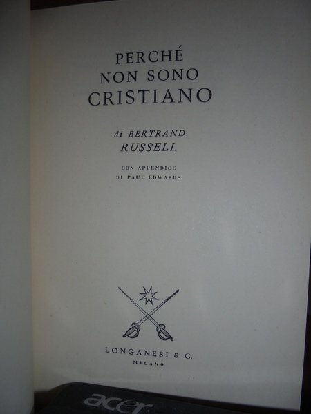 Bertrand, Russel. Milano, Longanesi & C., 1960. Perchè non sono Cristiano. In-16°, cart. edit. con 2 sovracopertine, una edit. l' altra in pellicola trsparente. 282, (2) pp. In ottimo stato di conservazione. Neg. esot. mob. 60