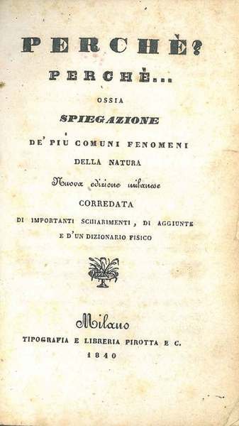 Perchè? Perchè. ossia Spiegazione de' più comuni fenomeni della natura. Nuova edizione milanese corredata di importanti schiarimenti, di aggiunte e d'un dizionario fisico