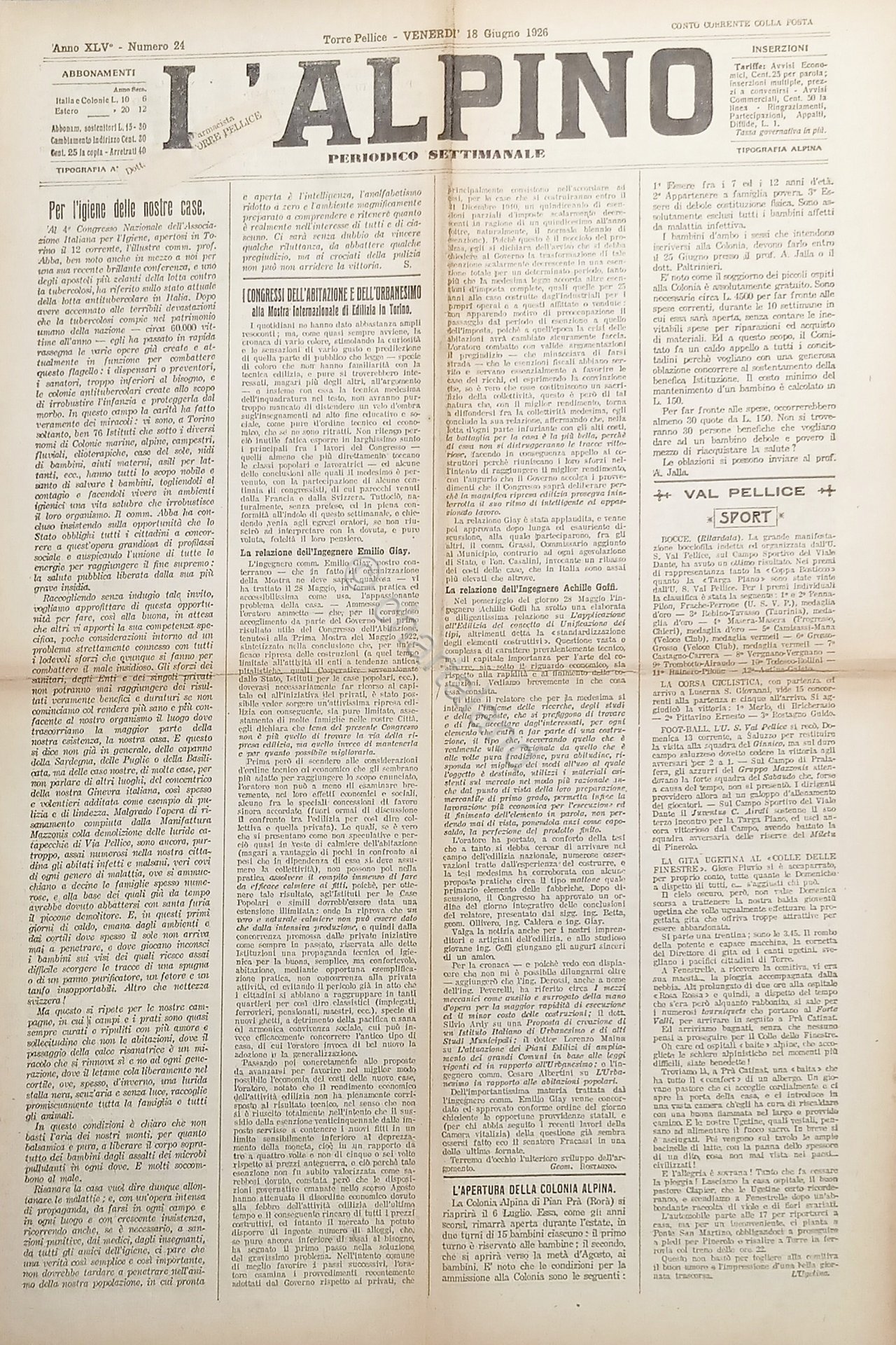 Periodico Settimanale Torre Pellice - L'Alpino N. 24 - Ingegnere E. Giay - 1926