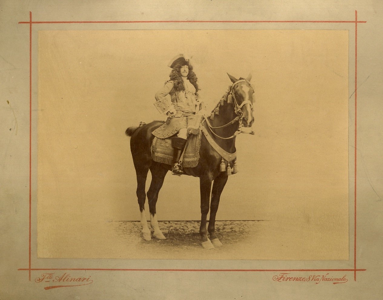 Firenze, F.lli Alinari, [c. 1880-1890], fotografia originale all'albumina, mm. 260x195, applicata editorialmente su cartoncino intestato al fotografo (mm. 398x278). Scattata - con ogni probabilità - in occasione d'una festa in costume. Ottime condizioni.
