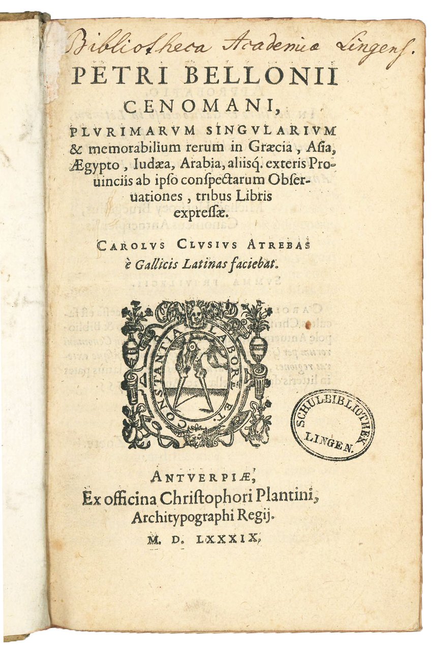 Petri Bellonii Cenomani, Plurimarum singularium & memorabilium rerum in Graecia, Asia, Aegypto, Iudaea, Arabia, aliisque exteris provinciis ab ipso conspectarum observationes, tribus libris expressae. Carolus Clusius Atrebas e Gallicis Latinas faciebat