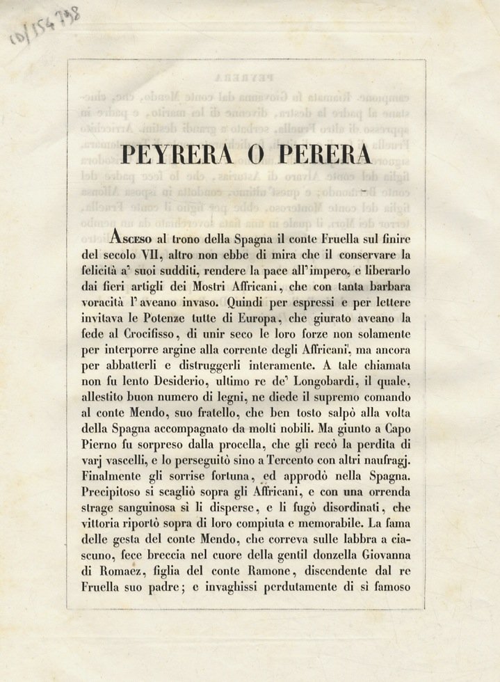 Lodi, Wilmant e figli, 1841-1848, in-4, privo di brossura, pp. [2]. Con un bello stemma accuratamente miniato a mano all'epoca, in vividi colori, su una tavola f.t. Fascicolo a fogli sciolti, dedicato alla storia della famiglia, tratto da "Teatro araldico, ovvero Raccolta generale delle armi ed insegne gentilizie delle più illustri e nobili casate che esisterono un tempo e che tuttora fioriscono in tutta Italia" di Leone Tettoni e F. Saladini, Lodi, Wilmant e figli, 1841-1848. Ottime condizioni.