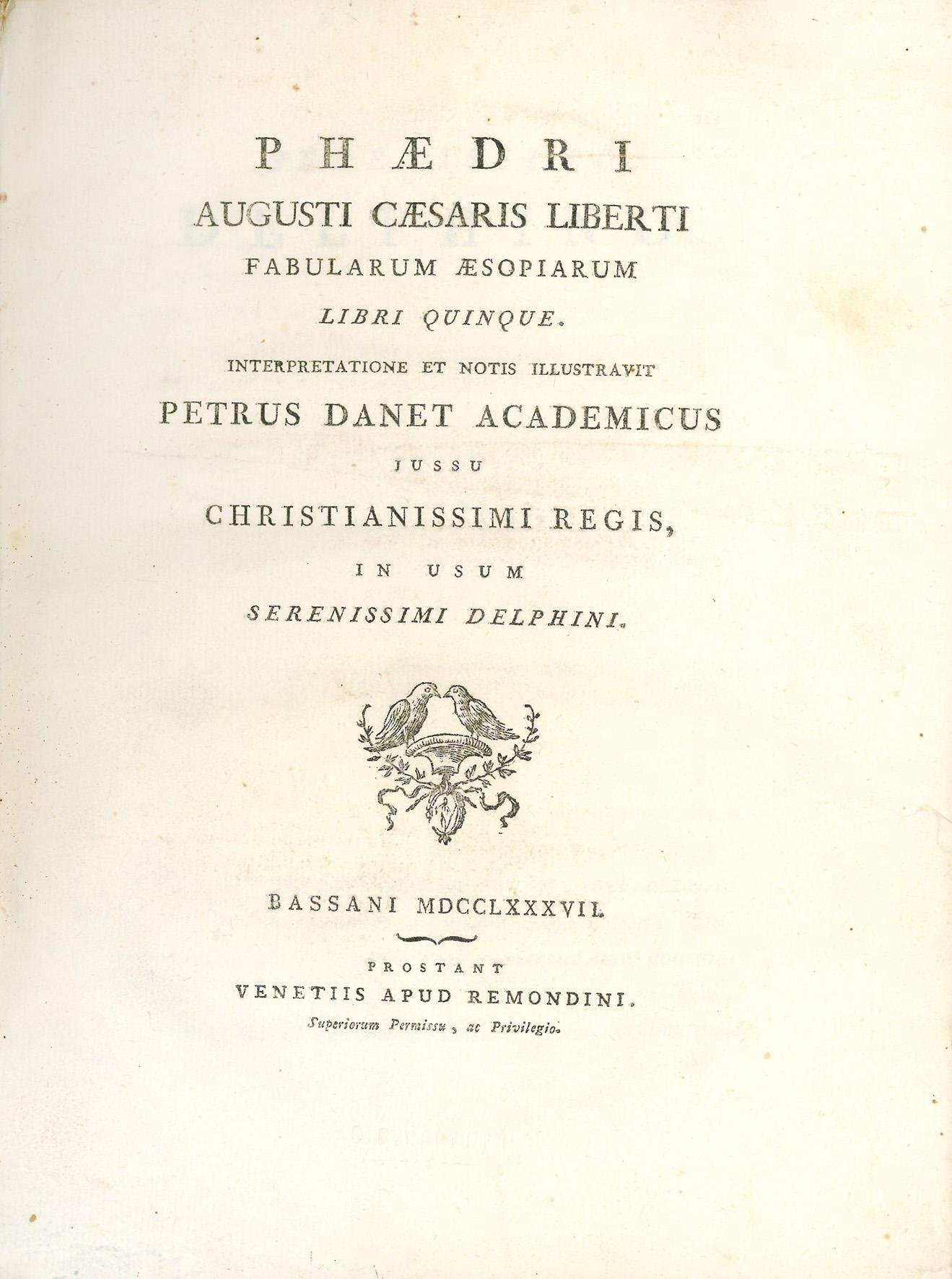 Phaedri Augusti Caesaris Liberti Fabularum Aesopiarum libri quinque. Interpretatione et notis illustravit Petrus Danet academicus jussu christianissimi regis, in usum serenissimi delphini