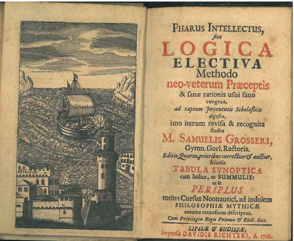 Pharus intellectus, sive Logica electiva methodo neo-veterum praeceptis & sanae rationis usui sano congrua, ad captum juventutis scholasticae digesta, imo iterum revisa & recognita studio m. Samuelis Grosseri. Editio quarta, prioribus correctior & auctio