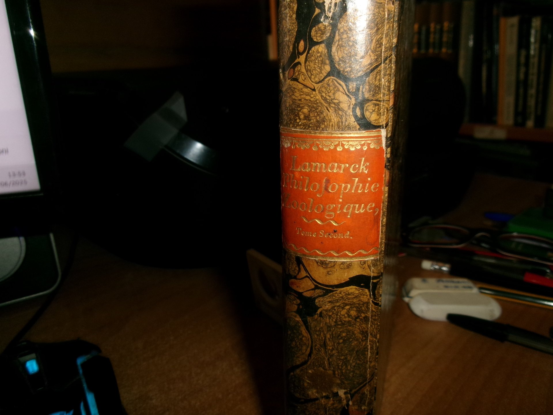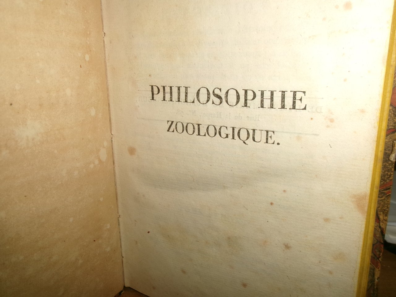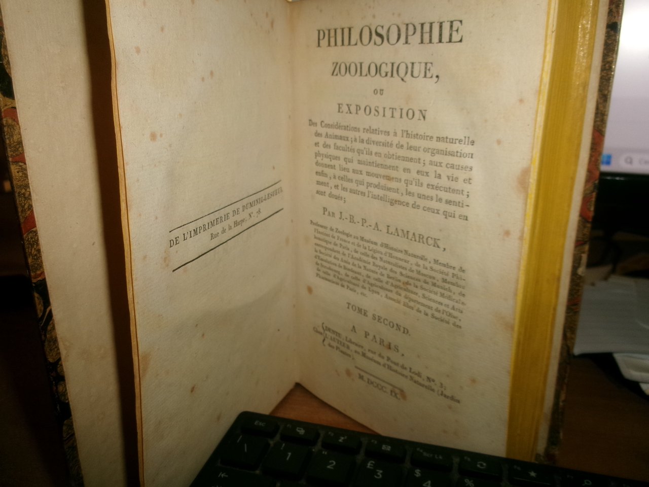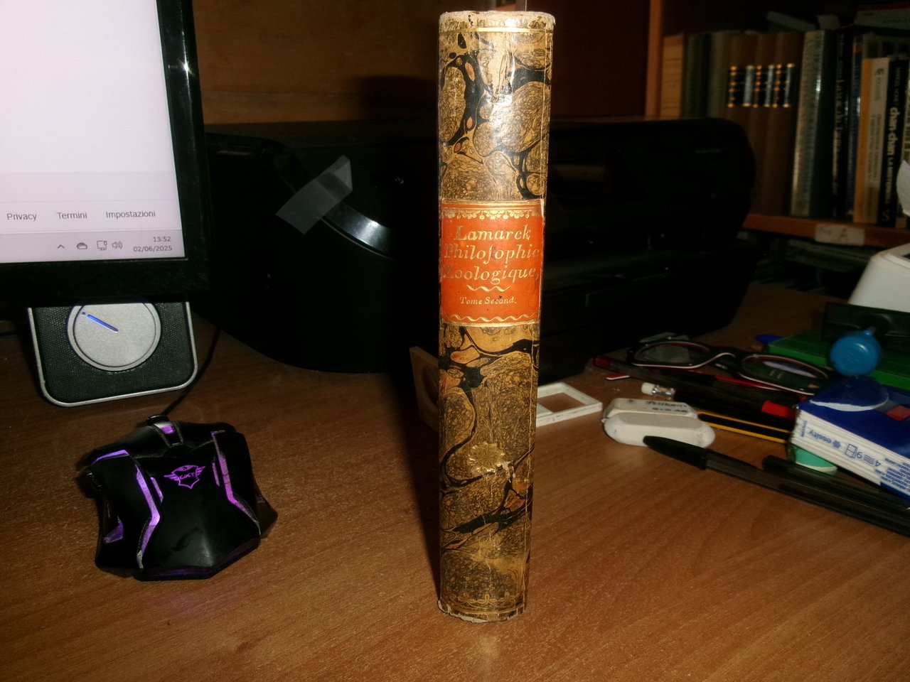 Lamarck, J.B.F.A. Philosophie zoologique, ou Exposition Des Considérations relatives à l' histoire naturelle des Animaux; à la diversité de leur organisation et des facultés qu'ils en obtiennent ; aux causes physiques qui maintiennent en eux leur vie et donnent lieu aux mouvements qu'ils exécutent ; enfin, à celles qui produisent les unes le sentiment, les autres l'intelligence de ceux qui en sont doués. Paris, Dentu et chez l' Auteur, 1809. Tome second (soltanto). In-8°, cartone coevo. (4), 475 pp. Bell' esemplare. Edizione originale rarissima. L' autore, famoso naturalista, è considerato un precursore di Darwin. Neg. mob. bianco sopra cassa. VENDIBILE SOLO IN ITALIA.