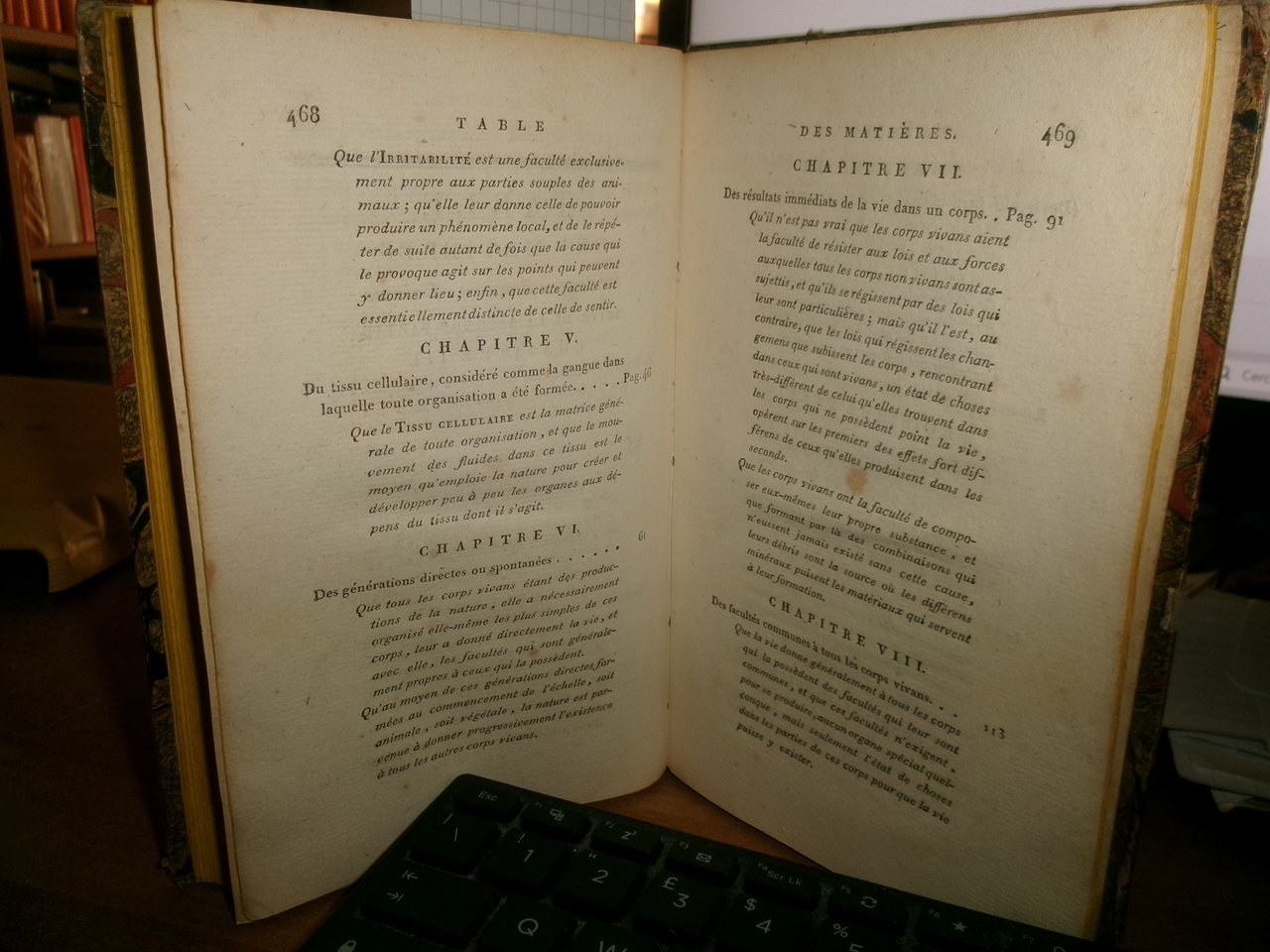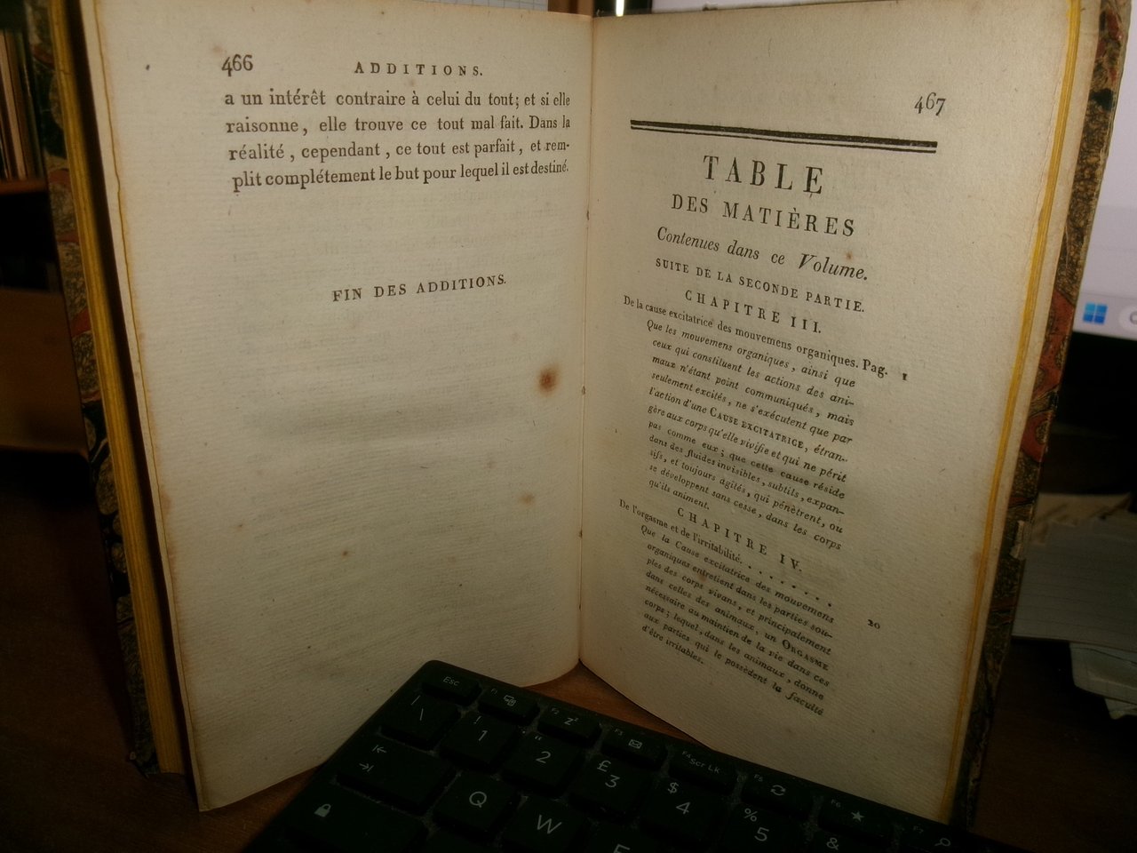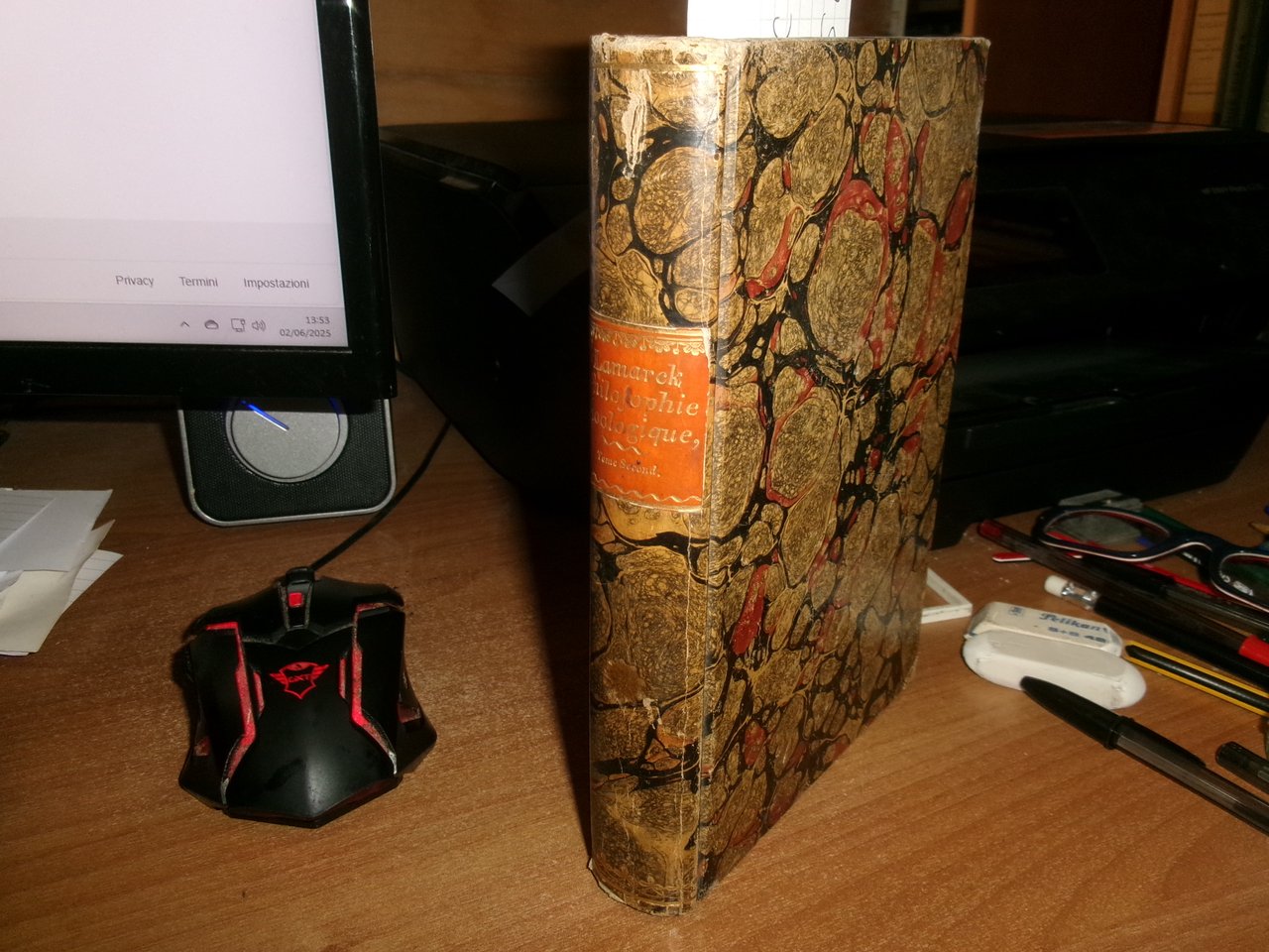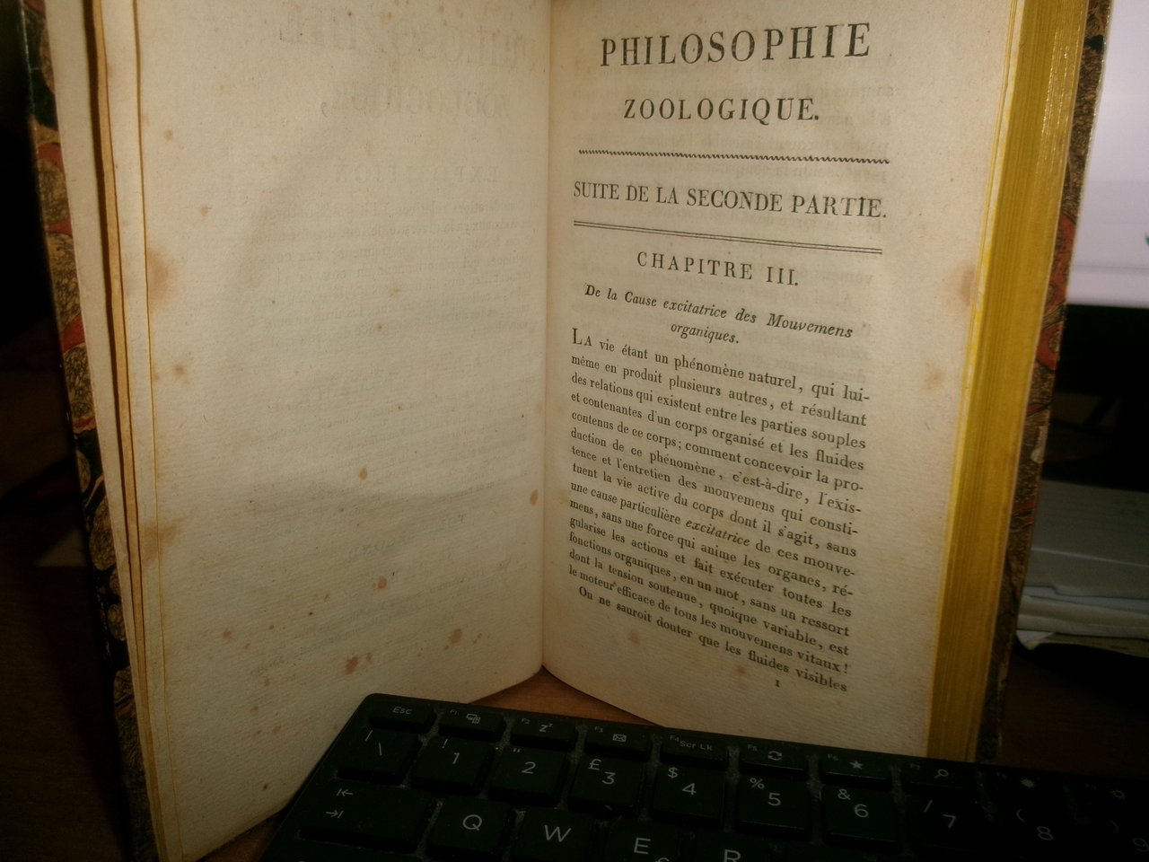 Lamarck, J.B.F.A. Philosophie zoologique, ou Exposition Des Considérations relatives à l' histoire naturelle des Animaux; à la diversité de leur organisation et des facultés qu'ils en obtiennent ; aux causes physiques qui maintiennent en eux leur vie et donnent lieu aux mouvements qu'ils exécutent ; enfin, à celles qui produisent les unes le sentiment, les autres l'intelligence de ceux qui en sont doués. Paris, Dentu et chez l' Auteur, 1809. Tome second (soltanto). In-8°, cartone coevo. (4), 475 pp. Bell' esemplare. Edizione originale rarissima. L' autore, famoso naturalista, è considerato un precursore di Darwin. Neg. mob. bianco sopra cassa. VENDIBILE SOLO IN ITALIA.