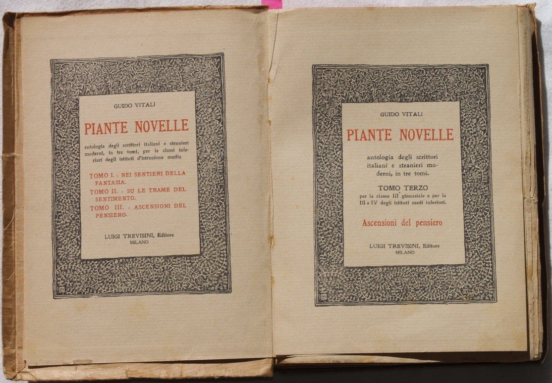 In 8. Dim. 21x15 cm. Pp. 456. Edizione senza data ma degli anni '20, '30 di questa antologia di scrittori italiani e stranieri per il ginnasio di Guido Vitali. L'opera era composta da tre tomi, siamo purtroppo in possesso solo del terzo tomo che tratta le ascensioni del pensiero. Tra gli scrittori presenti: Monti, Berchet, Carducci, Vitali, Manzoni, Foscolo, Giacosa, Fogazzaro, D'Annunzio, Barzini. Bel frontespizio incorniciato, bei capilettera e vignette all'interno. In buone condizioni. Brossura editoriale in buone condizioni generali con lievi usure ai margini e dorso. Rare fioriture. Not dated edition but of 1920's, 1930's of this anthology of italian and strangers writers for the high school by Guido Vitali. The work was made up of three tomes, unfortunately we only have the third tome talking about the ascensions of thoughts. Amont hte writers in the book: Monti, Berchet, Carducci, Vitali, Manzoni, Foscolo, Giacosa, Fogazzaro, D'Annunzio, Barzini. Beautiful framed title page, beautiful vignette and initial letters. In good conditions. Editorial cover in good general conditions slightly worn in the edges and spine. Occasional foxings.