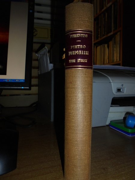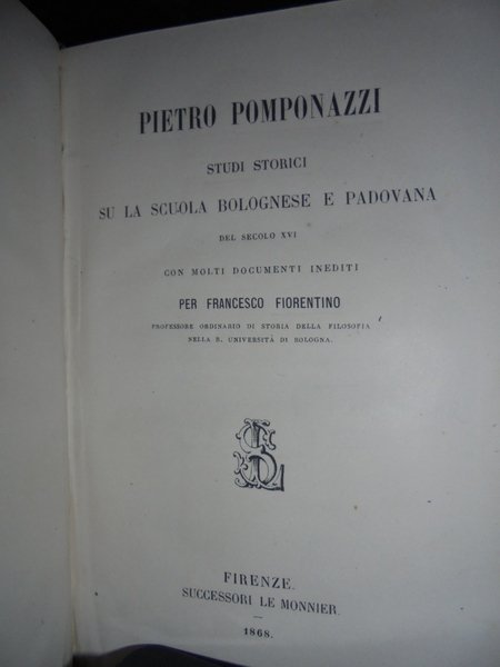 FIORENTINO, FRANCESCO. PIETRO POMPONAZZI. STUDI STORICI SU LA SCUOLA BOLOGNESE E PADOVANA DEL SECOLO XVI CON MOLTI DOCUMENTI INEDITI. FIRENZE, SUCCESSORI LE MONNIER, 1868. Prima edizione. IN-16°, TELA CON TITOLO IN ORO ENTRO TASSELLO AL DORSO. (2), 517, (3) PP. OTTIMO ESEMPLARE. NEG. U.T.E.T. MOB. 8