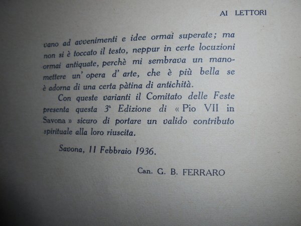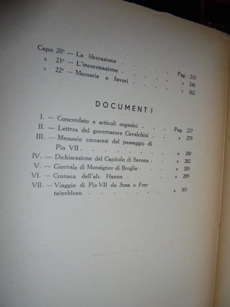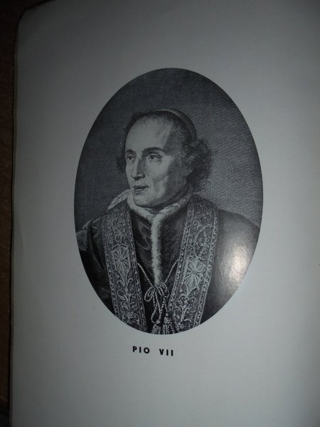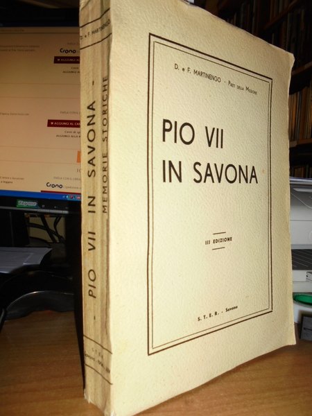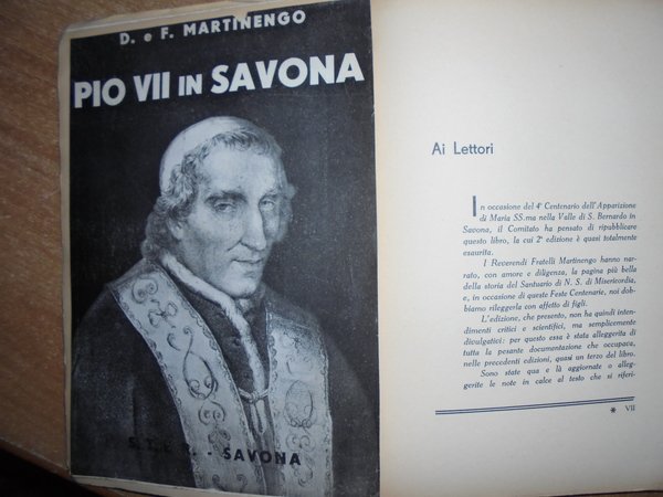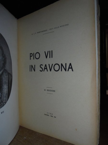 MARTINENGO [DOMENICO E FRANCESCO]. PIO VII in Savona. Savona, S.T.E.R., 1936 III edizione. In-8°, XII, 308, (1) pp. bross. edit. Con ritr. del Pontefice e degli autori in antip. Opera iniziata dal missionario Domenico e compiuta dal fratello, riguarda la figura del Pontefice che incoronò a imperatore Napoleone Bonaparte. Con ricco apparato di documenti al fine. Esemplare ben conservato e parzialmente intonso. Neg. esot. mob. 51