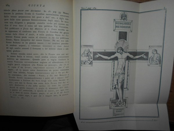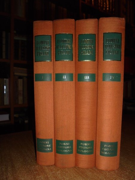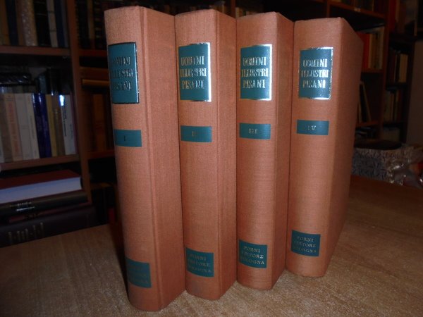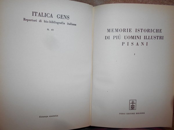 (Pisa) (FABRONI ANGELO). Bologna, Forni Editore. 1972. Memorie istoriche di piu Uomini illustri Pisani. 4 volumi in-8°, tela edit. con titoli in oro ai dorsi. xi, 384 pp. con 4 tavole fuori testo ripiegate.; xii, 402 pp.; xviii, 409 pp.; xvi, 480 pp. Ottimo esemplare in edizione anastatica. La galleria include scrittori, artisti, scienziati, politici, ecclesiastici e giuristi, tra cui: il bibliotecario e scrittore Pietro Diacono, il giurista Burgundio Pisano, il matematico Leonardo Fibonacci, il pittore Giunta Pisano (le tavole riproducono alcune delle sue opere, tra cui il Crocifisso di Santa Maria degli Angeli), gli scultori e architetti Nicola e Giovanni Pisano, il religioso Pietro Gambacorta, papa Eugenio III, lo scultore e architetto Andrea Pisano, lo scrittore Domenico Cavalca, papa Niccolò V. Unica donna citata, la pittrice Artemisia Gentileschi, cui sono dedicate tredici pagine. Uff. A - I - 2