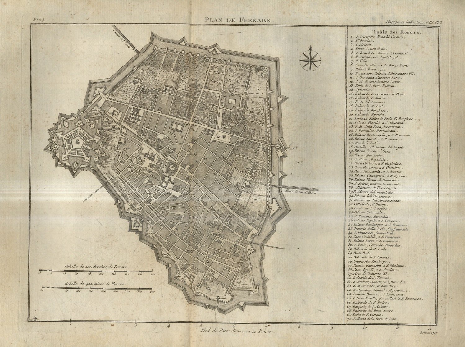 [Paris, 1786], pianta della città di Ferrara, incisa in rame, mm. 258x347 (l'impronta della lastra), mm. 293x475 (il foglio). Legenda con 70 richiami incisa nella parte destra. Tavola dell'opera di Jerome de Lalande "Atlas du Voyage d'un Français en Italie", Paris 1786. Traccia di piegatura centrale: buone condizioni.