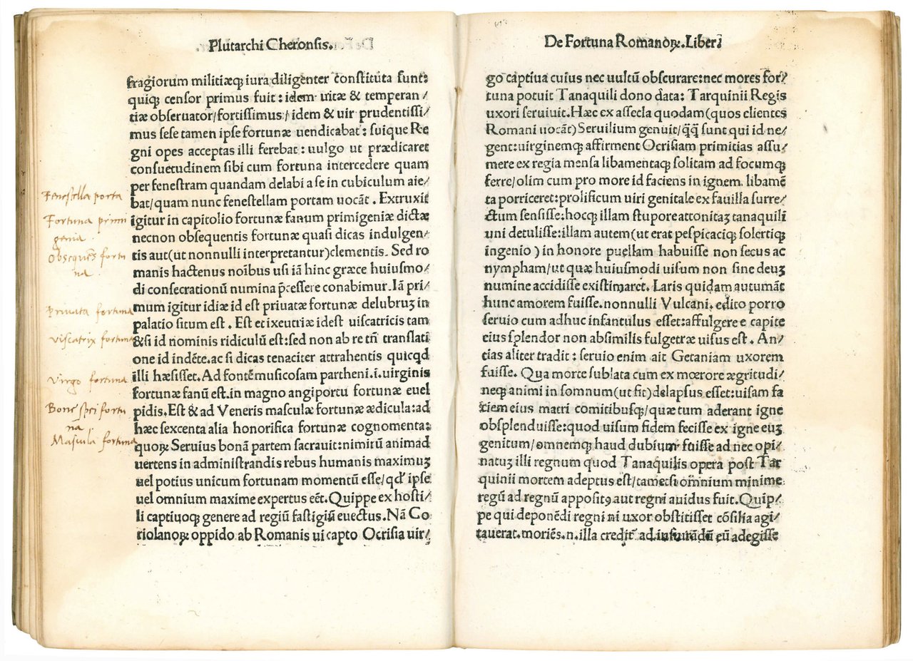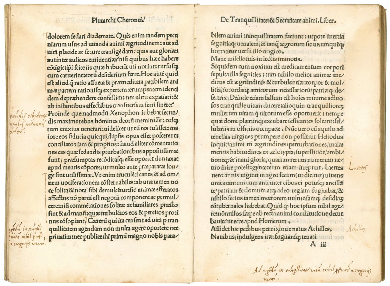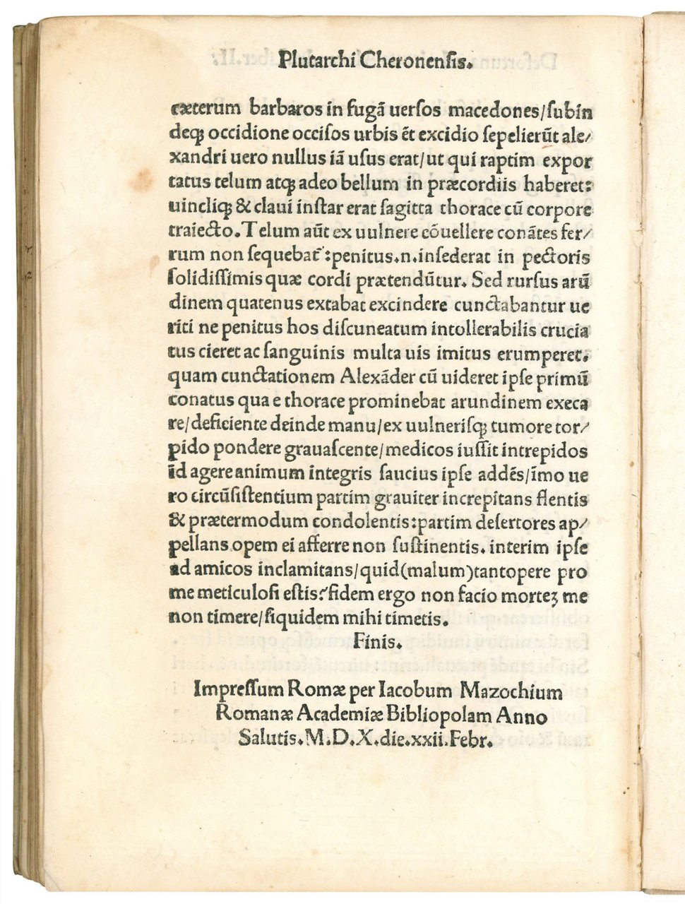 Plutarchi. De tranquillitate & securitate animi. Lib. I. De fortuna Romanorum ex Plutarcho. Lib. I. De fortuna vel virtute Alexandri. Lib. II. Basilii magni epistola de vita per solitudinem transigenda. Colophon: Impressum Romae per Iacobum Mazochium, Romanae academiae bibliopolam, M.D.X. die. xxii. Febr.