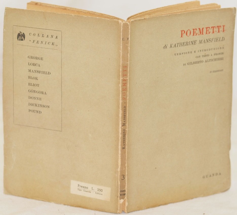 In 8. Dim. 19,5x13 cm. Pp. 131+(1). Seconda edizione del 1943 di questa raccolta di poemetti della scrittrice neozelandese Katherine Mansfield (1888-1923). Testo inglese con a fronte traduzione italiana. Versione e introduzione di Giblerto Altichieri. Dedica con firma all'occhietto datata 1956. In buone condizioni. Copertina editoriale in buone condizioni generali con lievi usure ai margini e dorso. Legatura in buone condizioni. All'interno le pagine si presentano in ottime condizioni con rare fioriture. Second edition of 1943 of this collection of little poems by new zealand writer Katherine Mansfield (1888-1923). English text with italian translation. Version and introduction by Giblerto Altichieri. Dedication with signature in the first title page dated 1956. In good conditions. Editorial cover in good general conditions slightly worn in the edges and spine. Binding in good conditions. Inside pages are in very good conditions with occasional foxings.