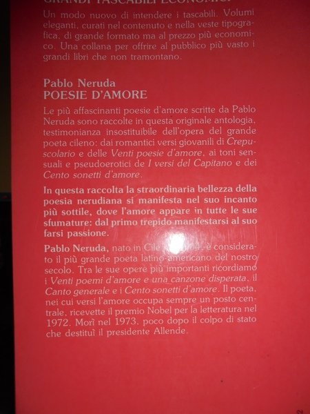 Pablo, Neruda. Roma, Newton, 1990. Poesie d' amore. Passione, sensualità ed erotismo nelle poesie più affascinanti del grande poeta cileno. A cura di Giuseppe Bellini. Testo spagnolo a fronte. In-8°, cart. edit. 204, (4) pp. Come nuovo. Neg. mob. 8
