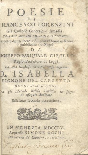 POESIE DI FRANCESCO LORENZINI. Già Custode Generale di Arcadia, tra gli Arcadi Filacida Luciniano, raccolte da un dotto e diligente Uomo in Roma e pubblicate in Napoli da Gioseffo Pasquale Cirillo.