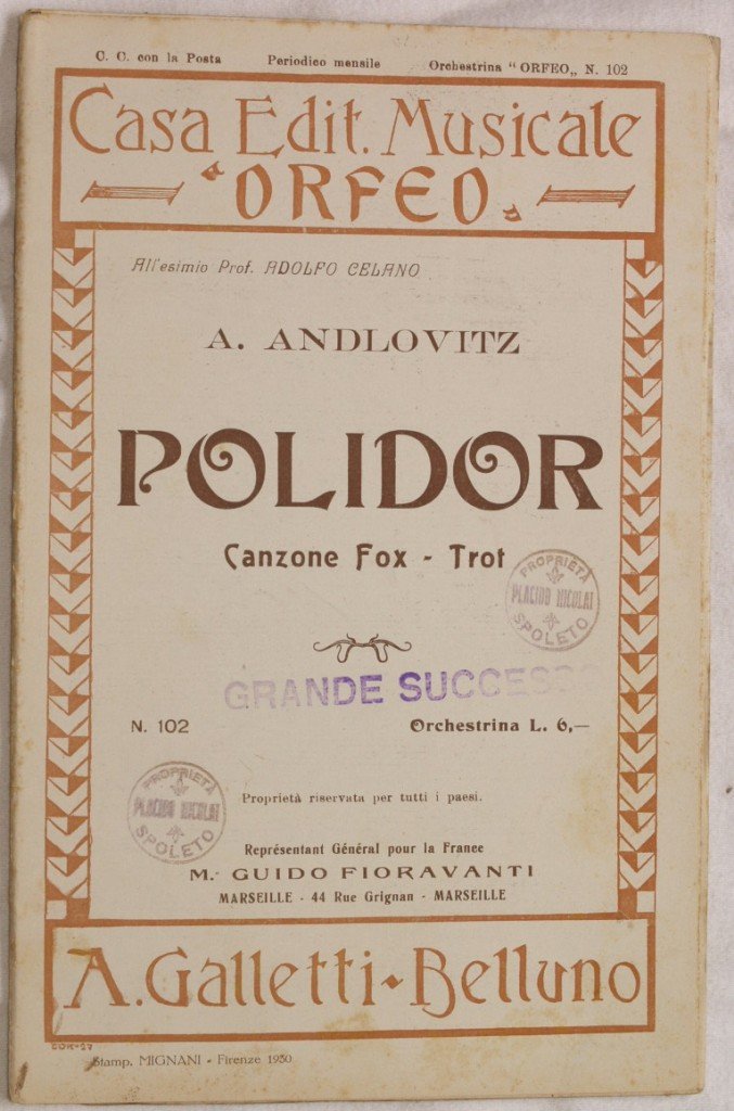 In 8. cm 27x18. pp 18. partitura completa per orchestra del 1930 di una canzone.<BR>Caratteristica copertina illustrata d'epoca. ex libris in copertina. In ottime condizioni. a complete score for orchestra of 1930. Carachteristic decorated cover of that period. In very good conditions.