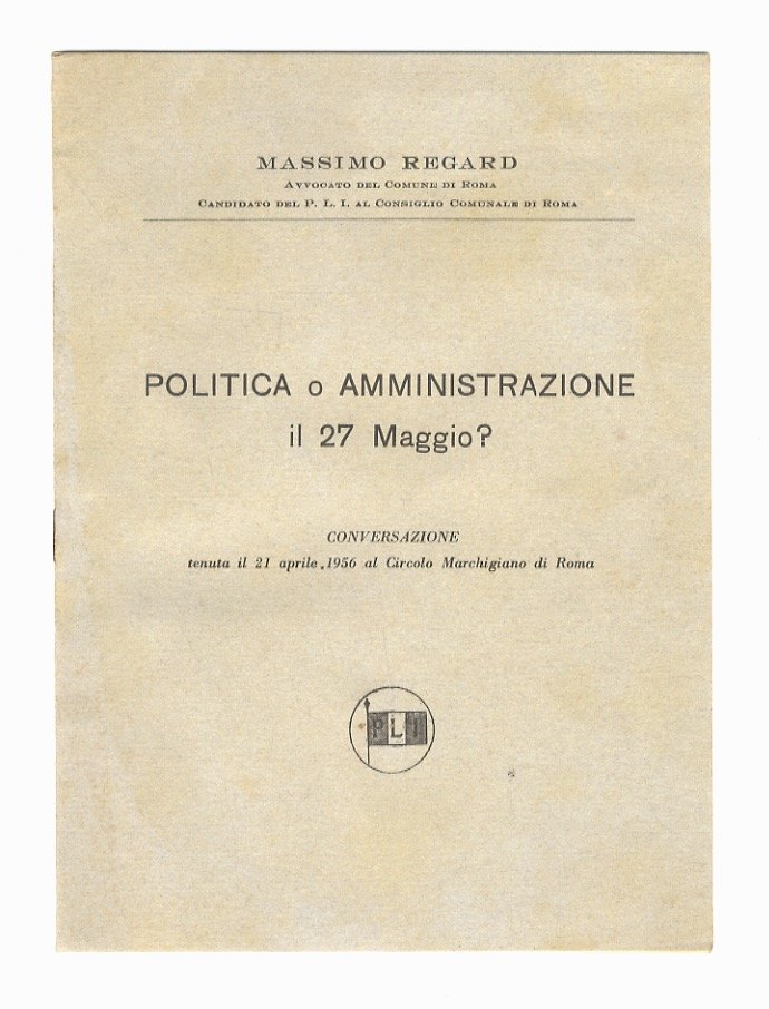 Roma, Stabilimento Tipo-Litografico V. Ferri, [1956], in-16, br. editoriale, pp. 8. Massimo Regard era un candidato del P.L.I. al Consiglio Comunale di Roma.