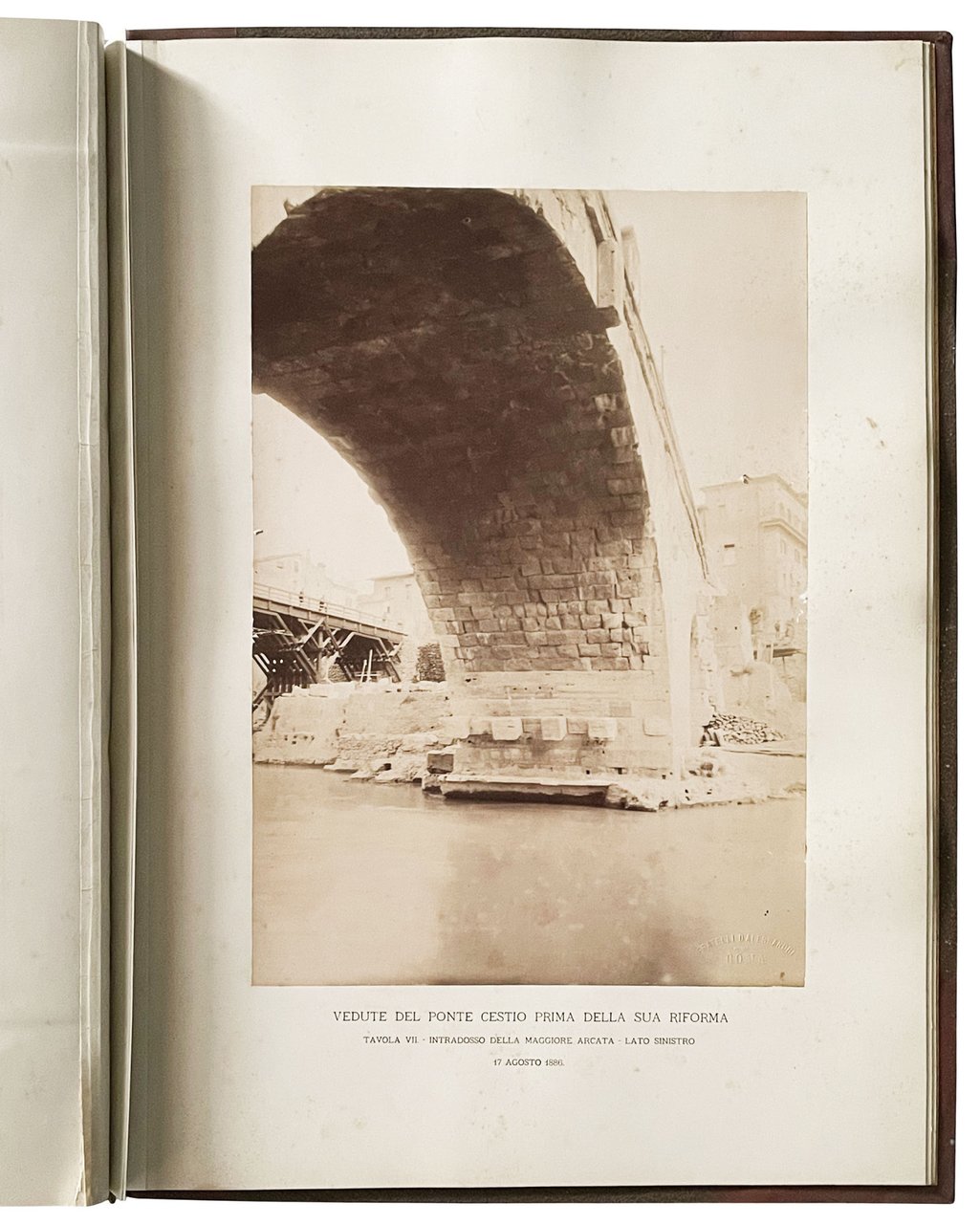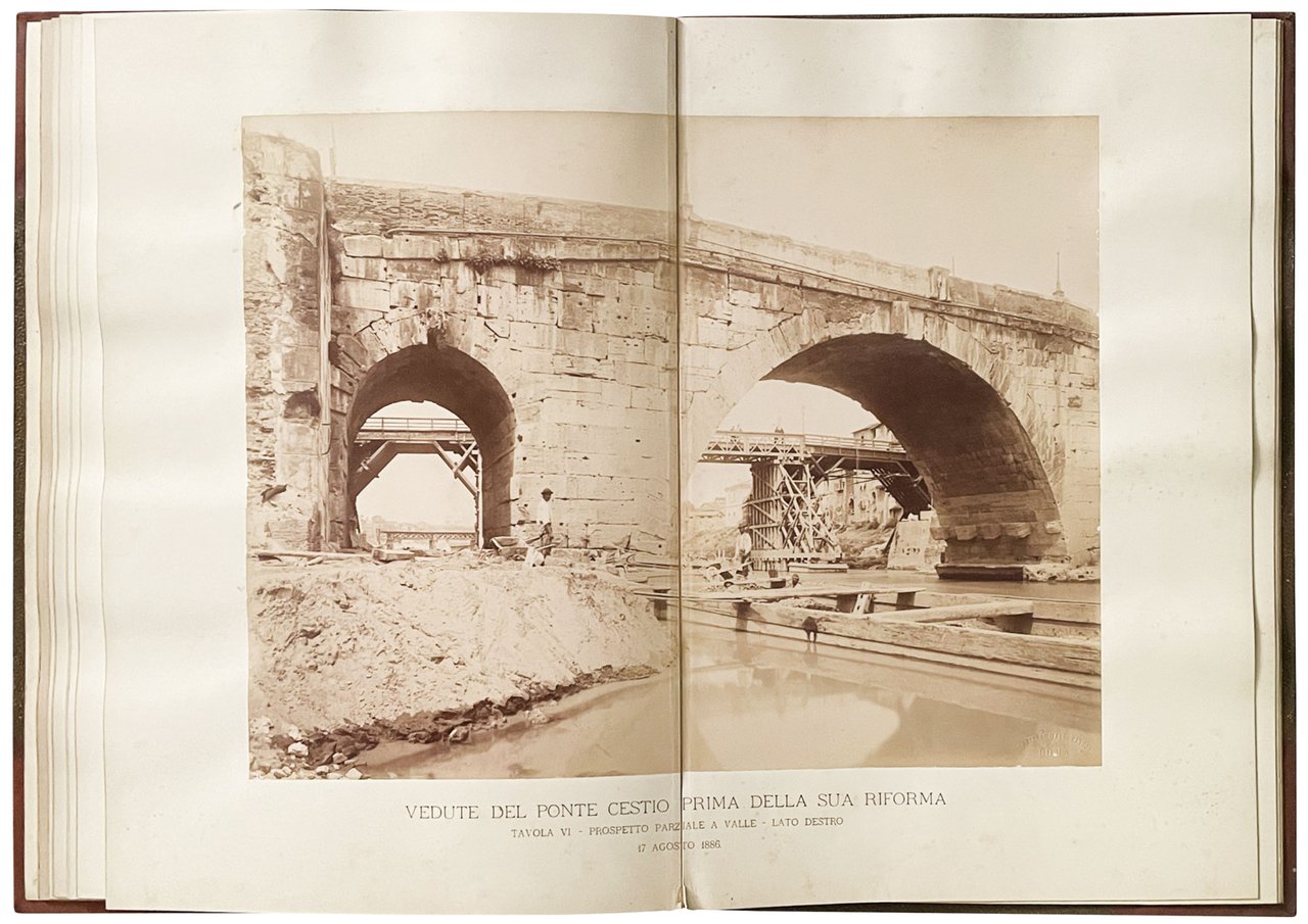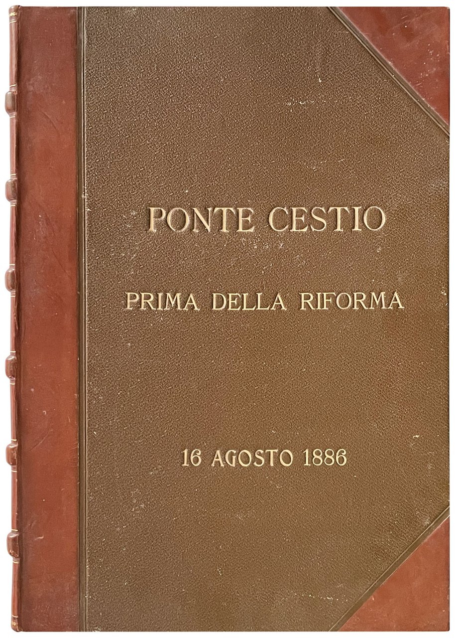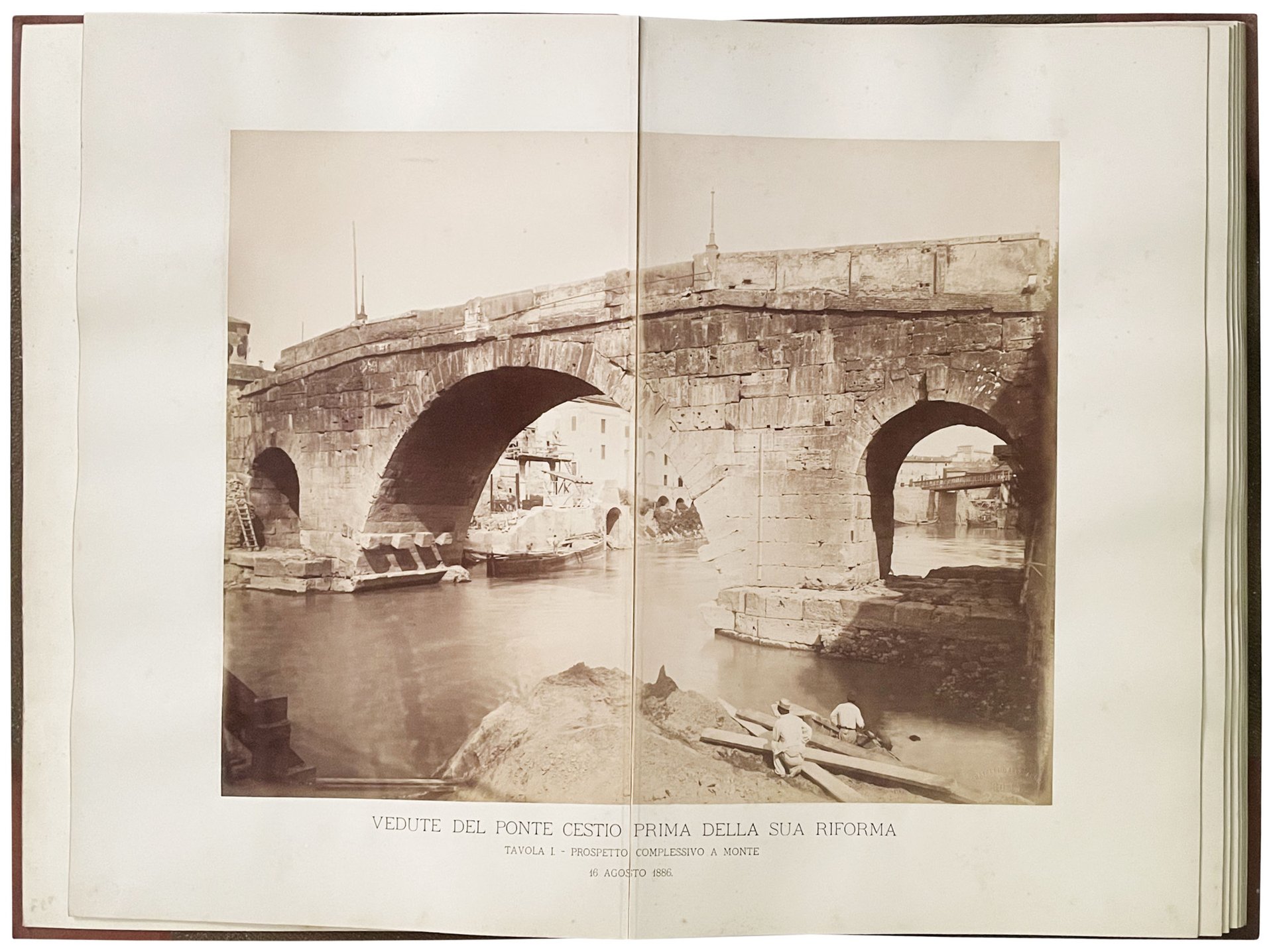 Folio (543x400 mm). Album with 8 original photographs by D'Alessandri showing different views of Ponte Cestio, all in albumen print and applied on thick cardboard with a brief caption. Six of those are on double-page, and the last two on single pages. Original half-leather, gilt title and date on the front panel, spine with six raised bands. Slightly foxed and stained, but a very well-preserved copy.