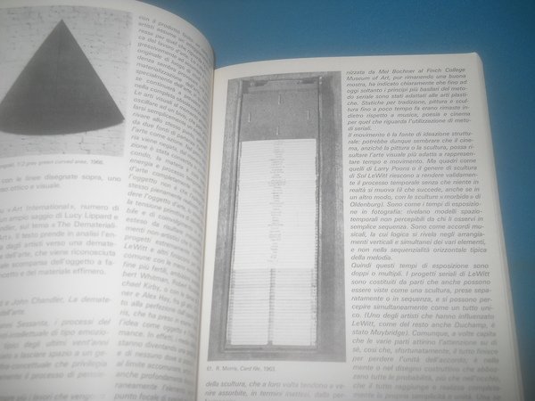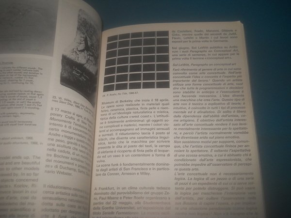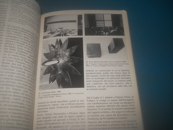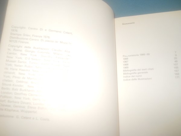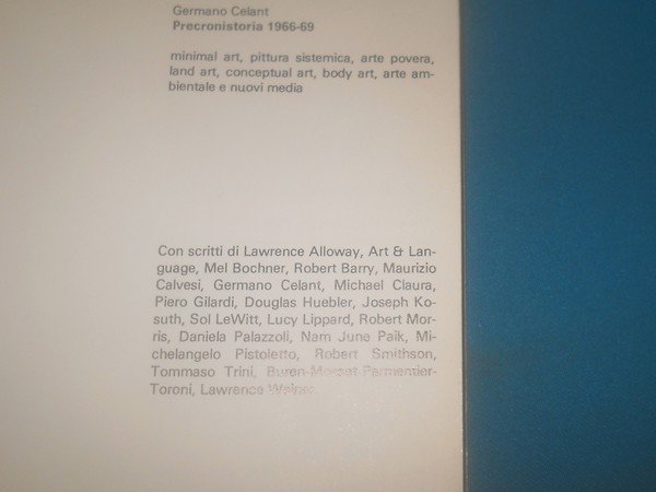 Il periodo tra il 1966 e il 1969 è segnato da sintomi di uno sconvolgimento artistico, risultato anticipatorio delle vicende linguistiche che, dopo la Pop Art, hanno dato corpo alla Minimal Art, alla Conceptual Art, alla Land Art, all’Arte povera e alla Body Art. Questa precronistoria, stesa da Germano Celant nel 1972 e pubblicata nel 1976 da Centro Di, Firenze, prende in esame gli avvenimenti collettivi – costituiti principalmente da mostre e da fonti scritte, quali saggi, pubblicazioni e dichiarazioni – che prefigurano questi movimenti, affermatisi anche per l’uso di media tecnologici o non tradizionali, quali fotografia, videotape, disco, libro e film. Il materiale raccolto è di tale importanza storica da spingere l’autore e l’editore a proporne, cinquant’anni dopo, una riproduzione fotografica con un nuovo saggio introduttivo. Il volume risulta fondamentale, ancora oggi, per la conoscenza e per lo studio, critico e teorico, degli avvenimenti artistici di quegli anni.