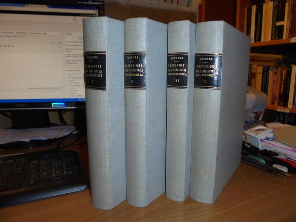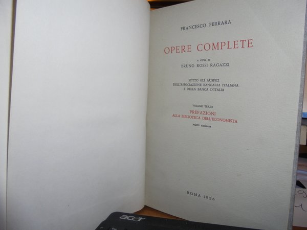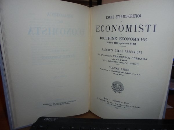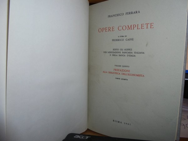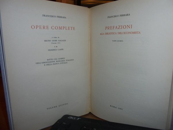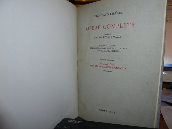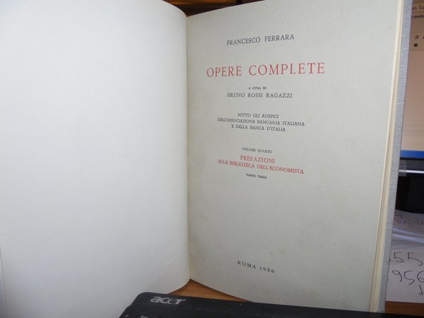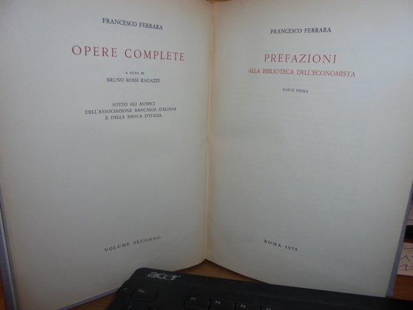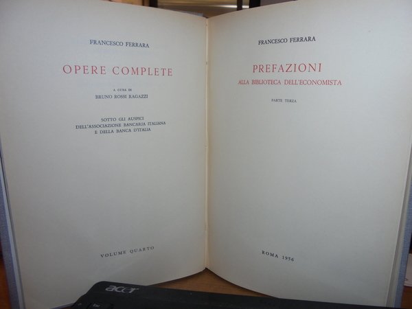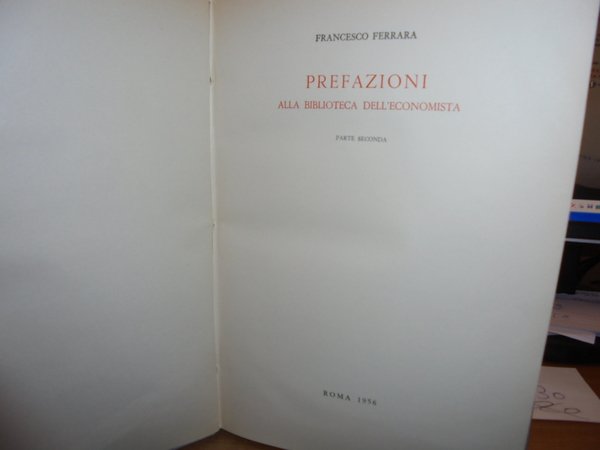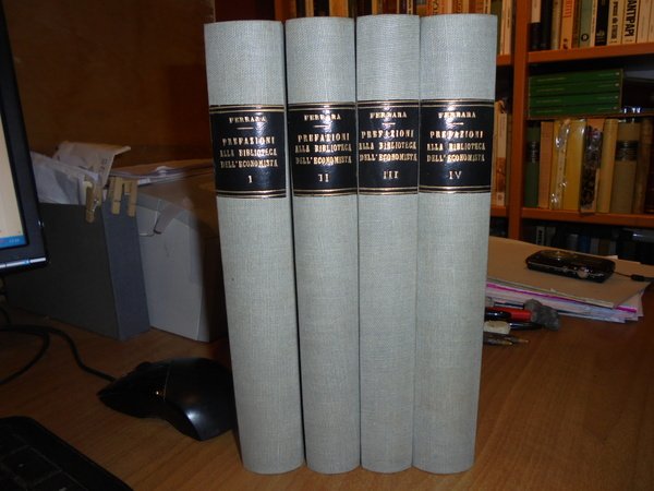 FRANCESCO, FERRARA. Roma, Ist. Grafico Tiberino, 1955 - 1961. PREFAZIONI alla Biblioteca dell' Economista. 4 parti in 4 volumi in-8°, tela con titoli in oro entro tasselli ai dorsi, copertine originali conservate. xxviii, 568, (1) pp.; 521, (1) pp.; 420, (1) pp.; 589, (13) pp. Esemplare in ottimo stato di conservazione a tiratura limitata. Uff. B - III - 1