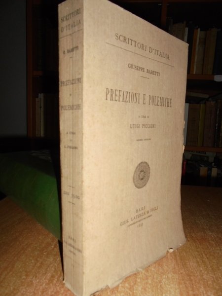 Scrittori d' Italia. Giuseppe, Baretti. Bari, Gius. Laterza & Figli, 1933. PREFAZIONI E POLEMICHE a cura di Luigi Piccioni. Seconda edizione. In-8°, br. orig. con unghie. 411 pp. In ottimo stato di conservazione. Testo trilingue. Neg. mob. 14