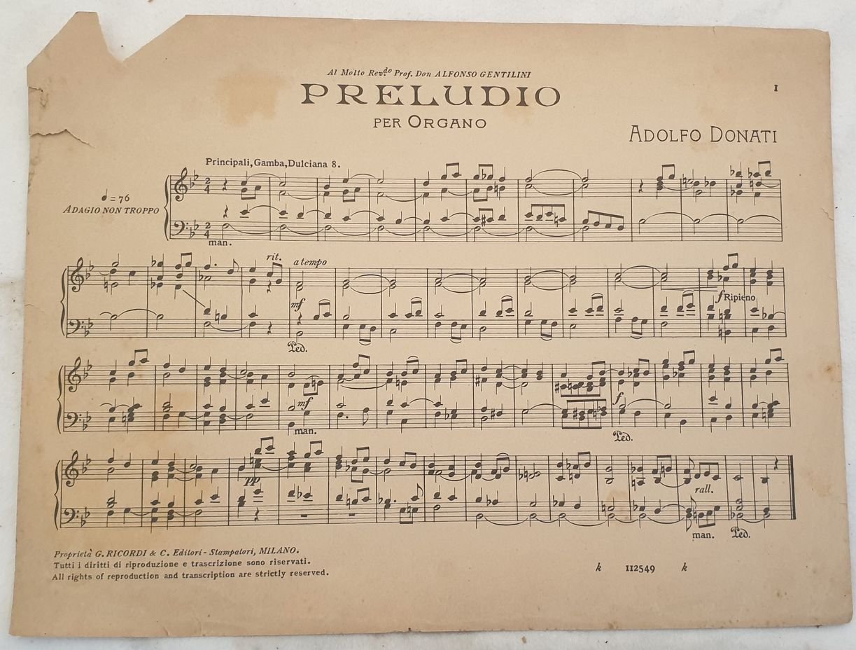 Partitura per organo di inizio novecento della melodia "Preludio" di Adolfo Donati. In buone condizioni con rare fioriture e strappi marginali. Formato cm. 23x30,5. Pp. 1. Musical score for piano of early XX century of the melody "Preludio" by Adolfo Donati In good conditions with occasional foxings and tears in the extremities. Size cm. 23x30,5. Pp. 1.